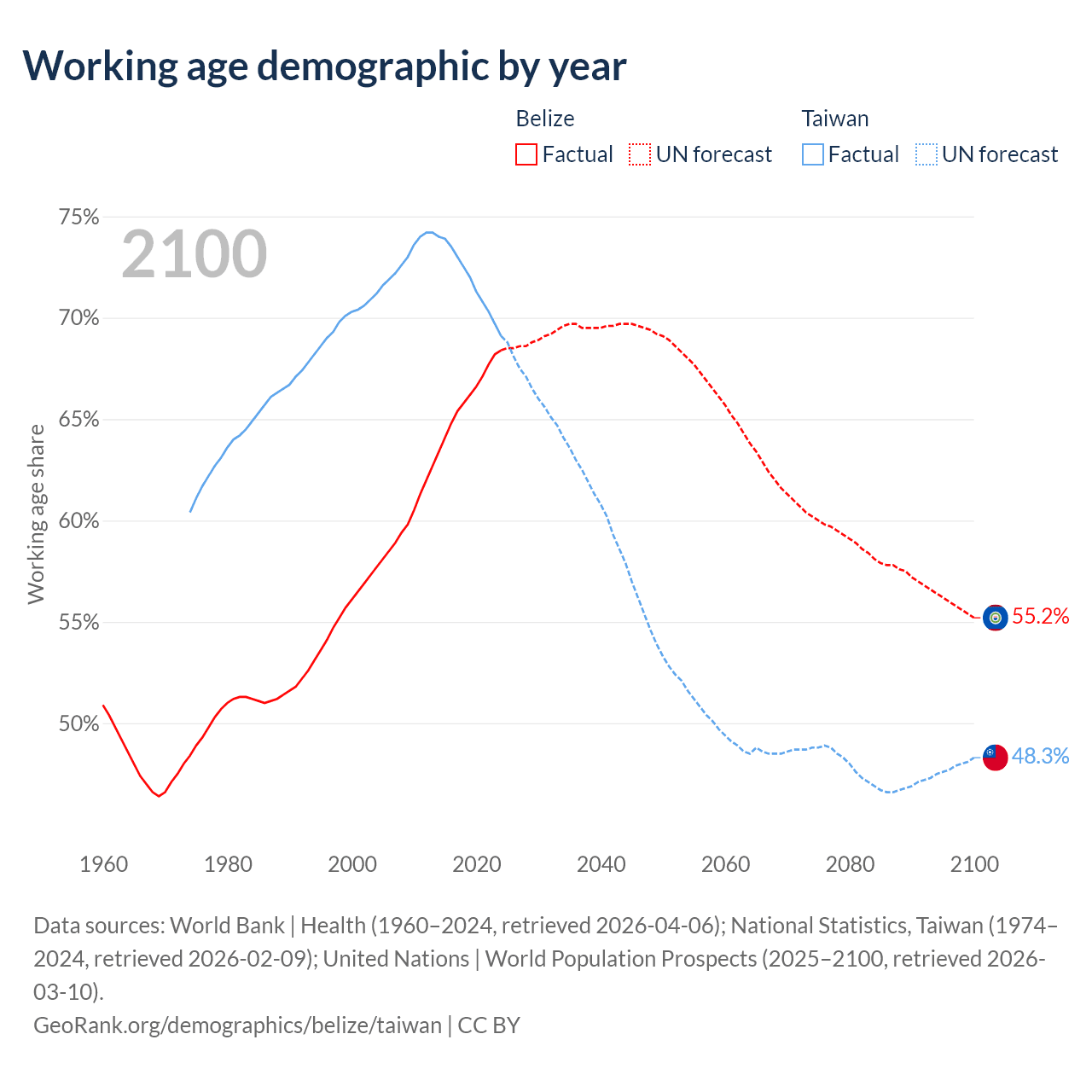- Belize has 294K working age adults (aged 15-64) vs 16.1M in Taiwan.