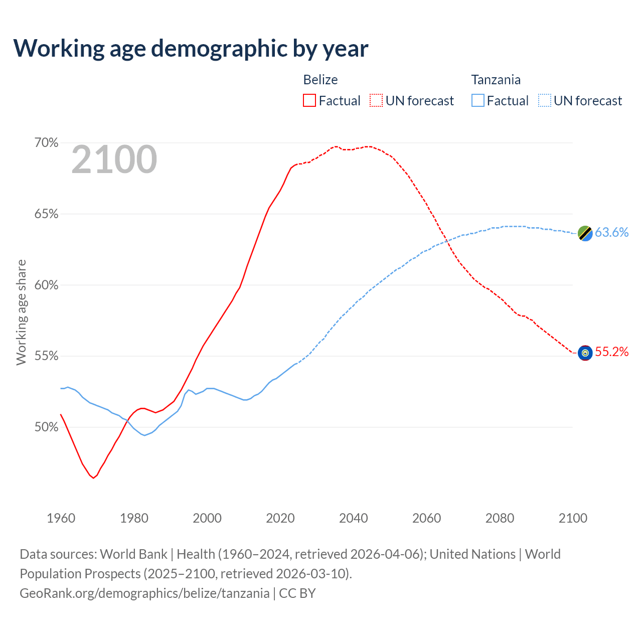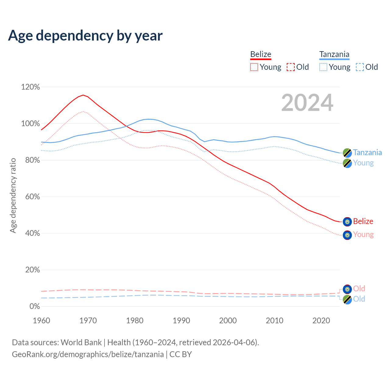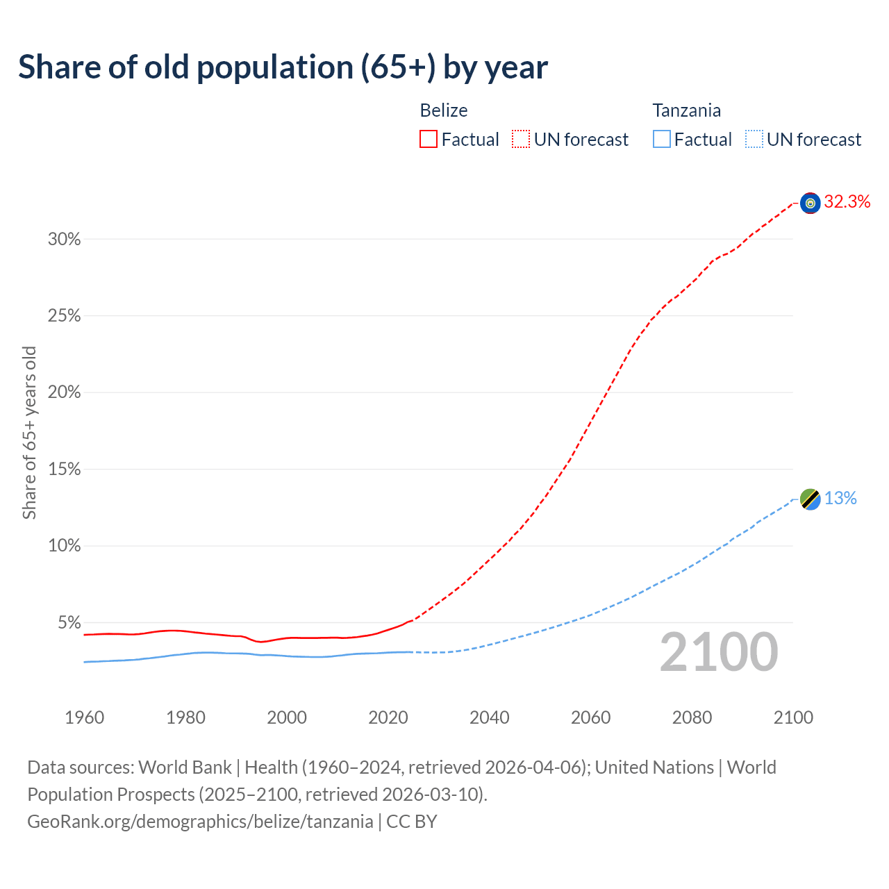 - The share of old-age demographic (65+) in Belize is 5.02% vs 3.05% in Tanzania.
