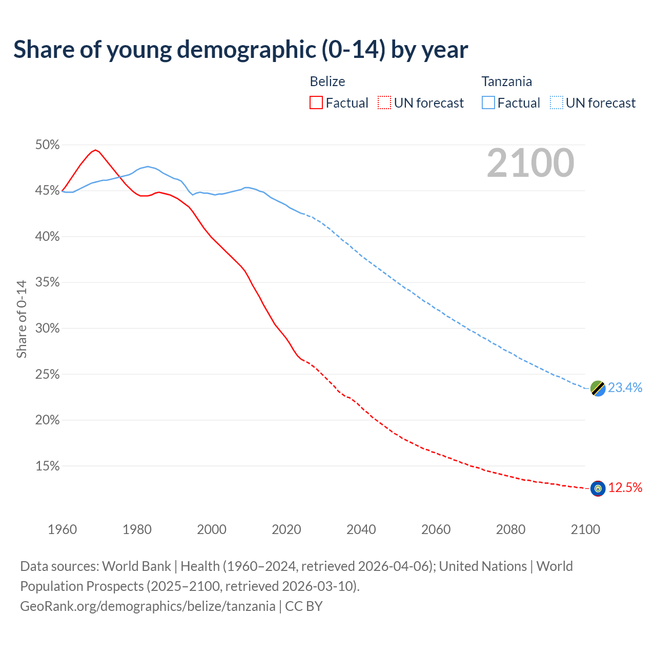 - The share of young demographic (0-15 years old) in Belize is 26.6% vs 42.5% in Tanzania.