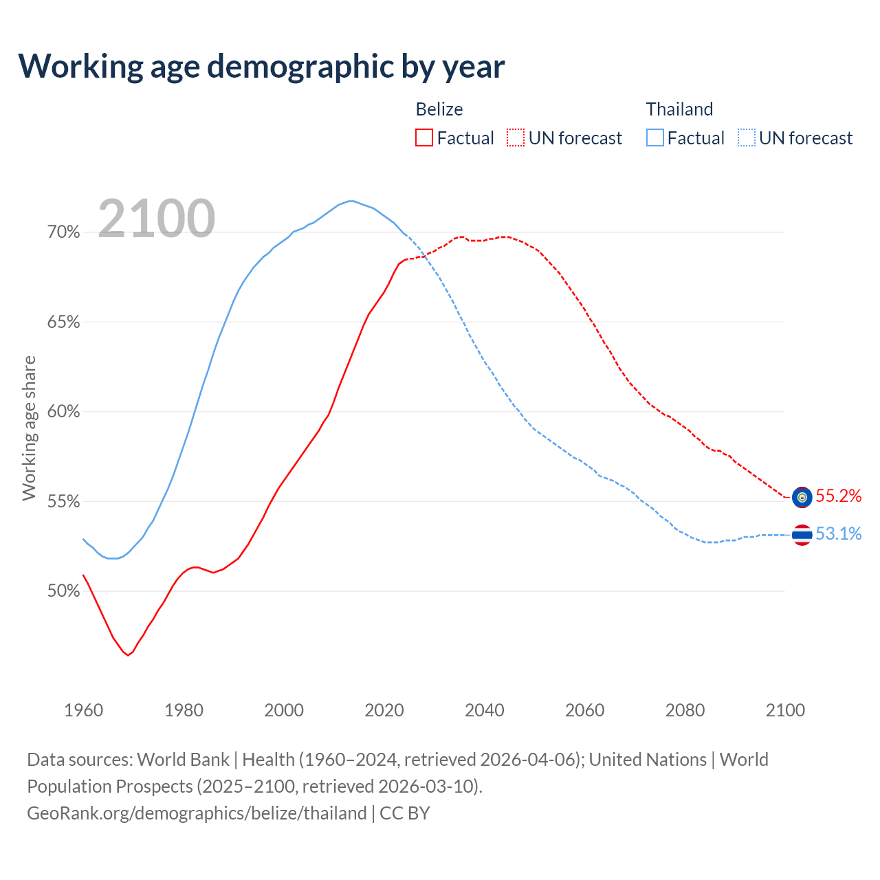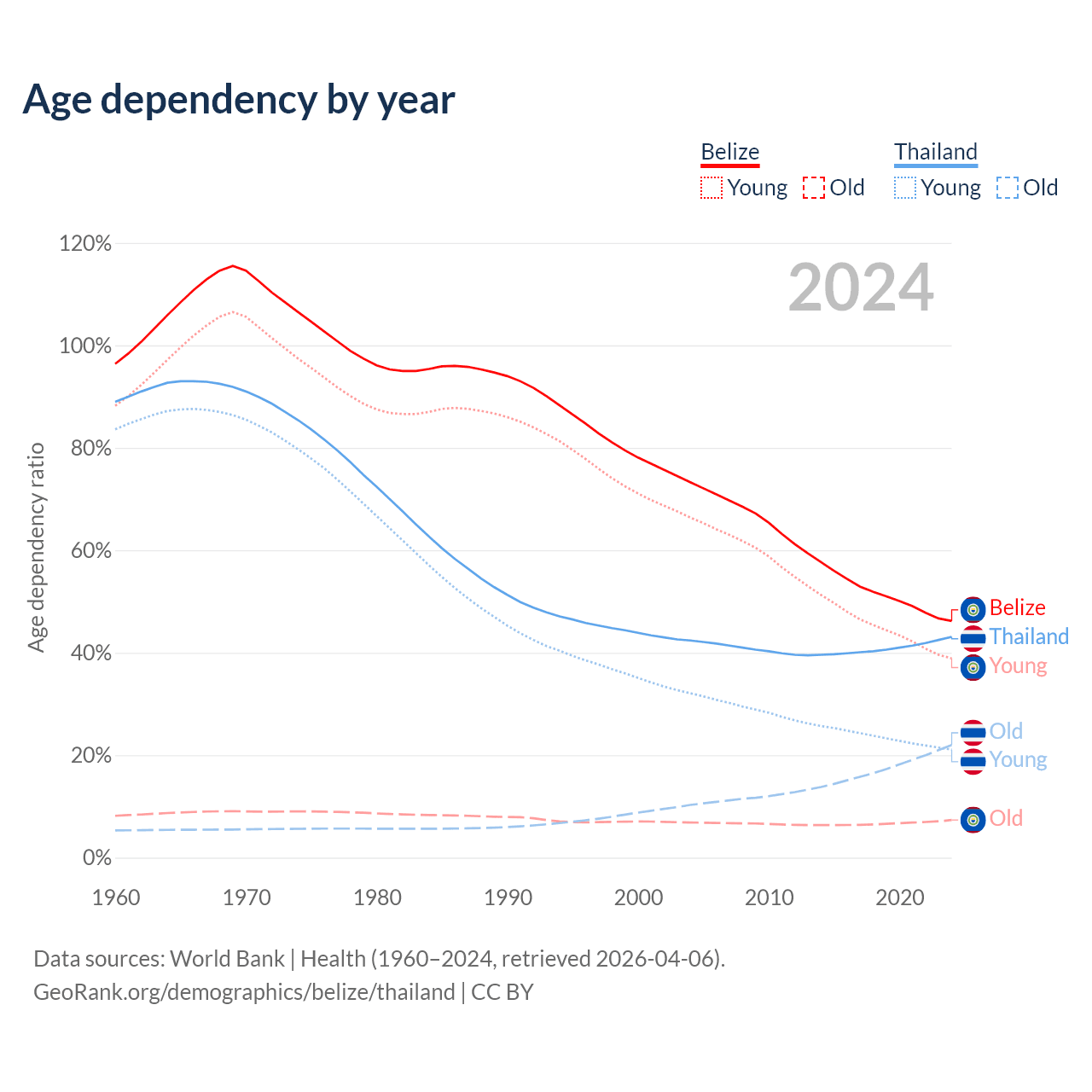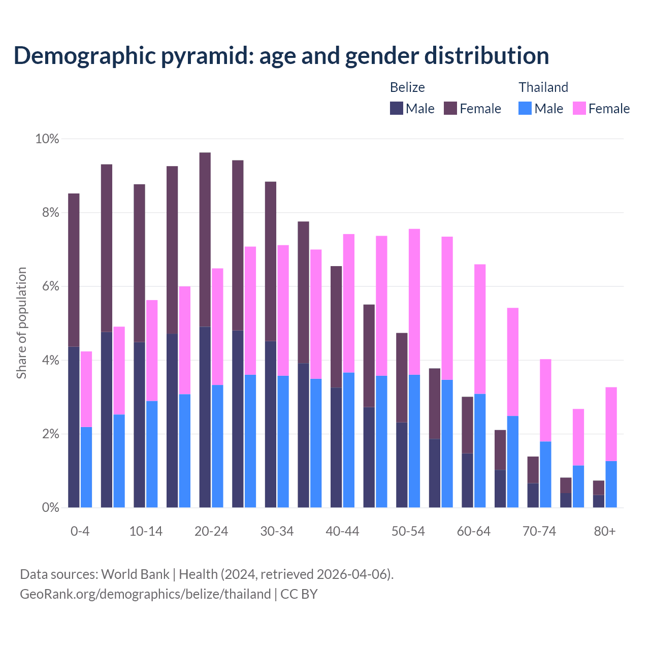 - Belize is ranked 120/196 by median age (oldest to youngest) vs 40/196 for Thailand.