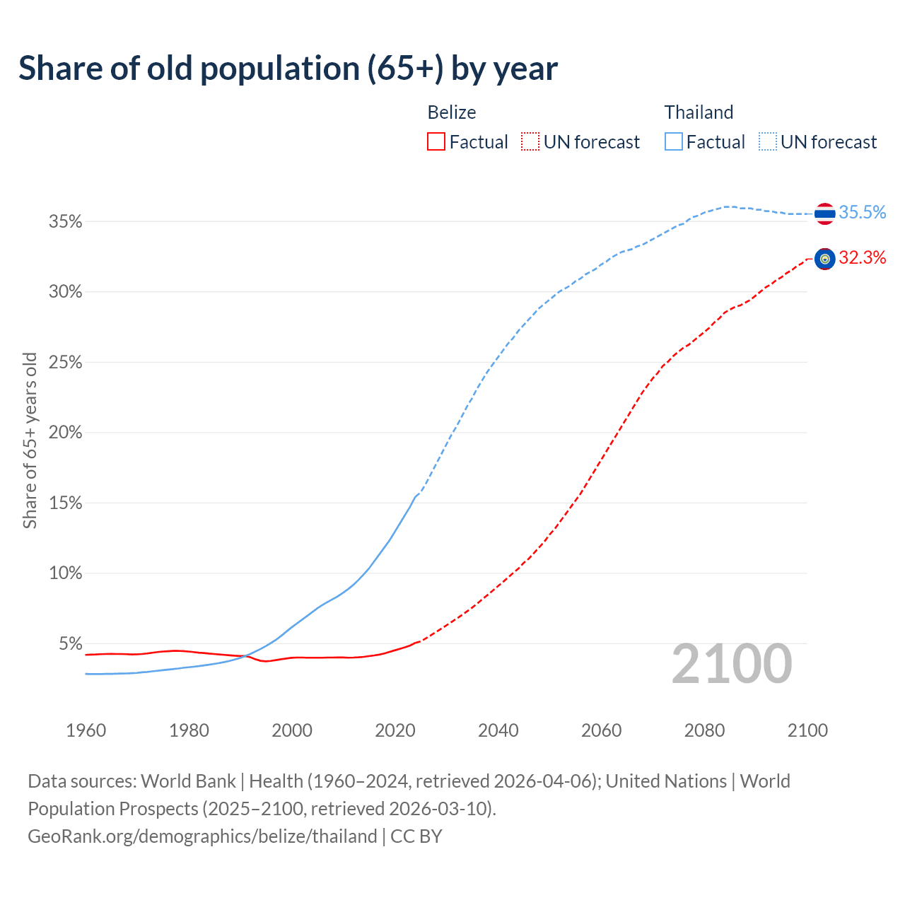 - The share of old-age demographic (65+) in Belize is 5.02% vs 15.4% in Thailand.