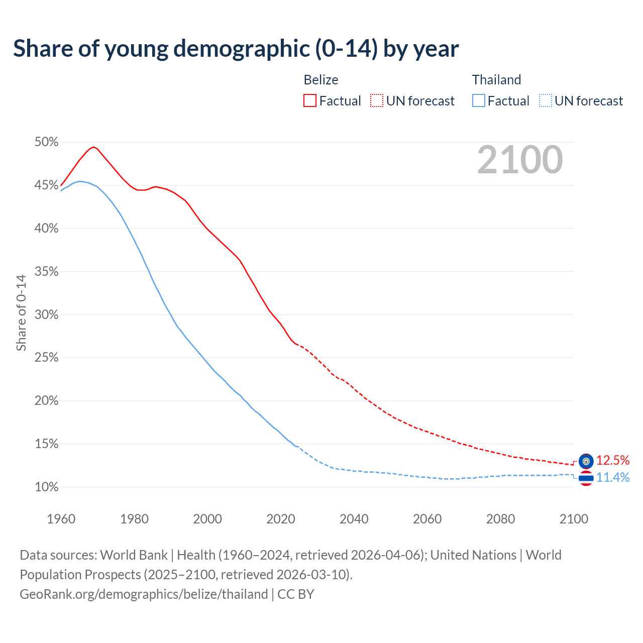 - The share of young demographic (0-15 years old) in Belize is 26.6% vs 14.7% in Thailand.