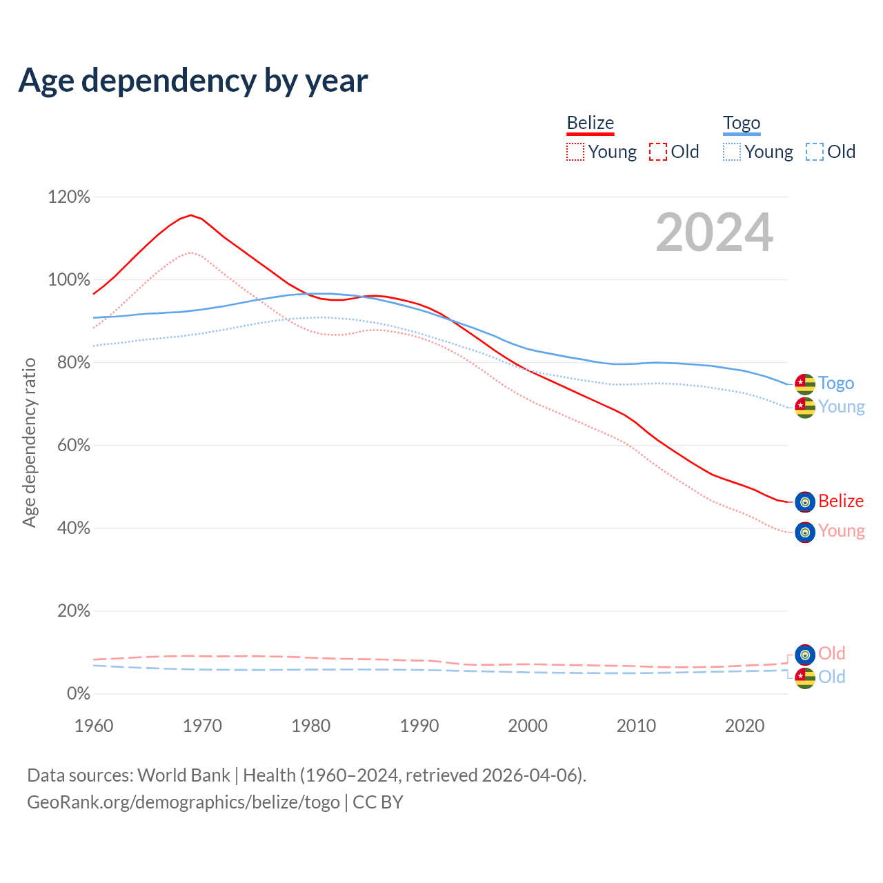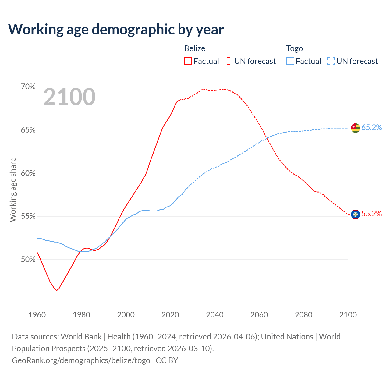 - The share of old-age demographic (65+) in Belize is 5.02% vs 3.21% in Togo.