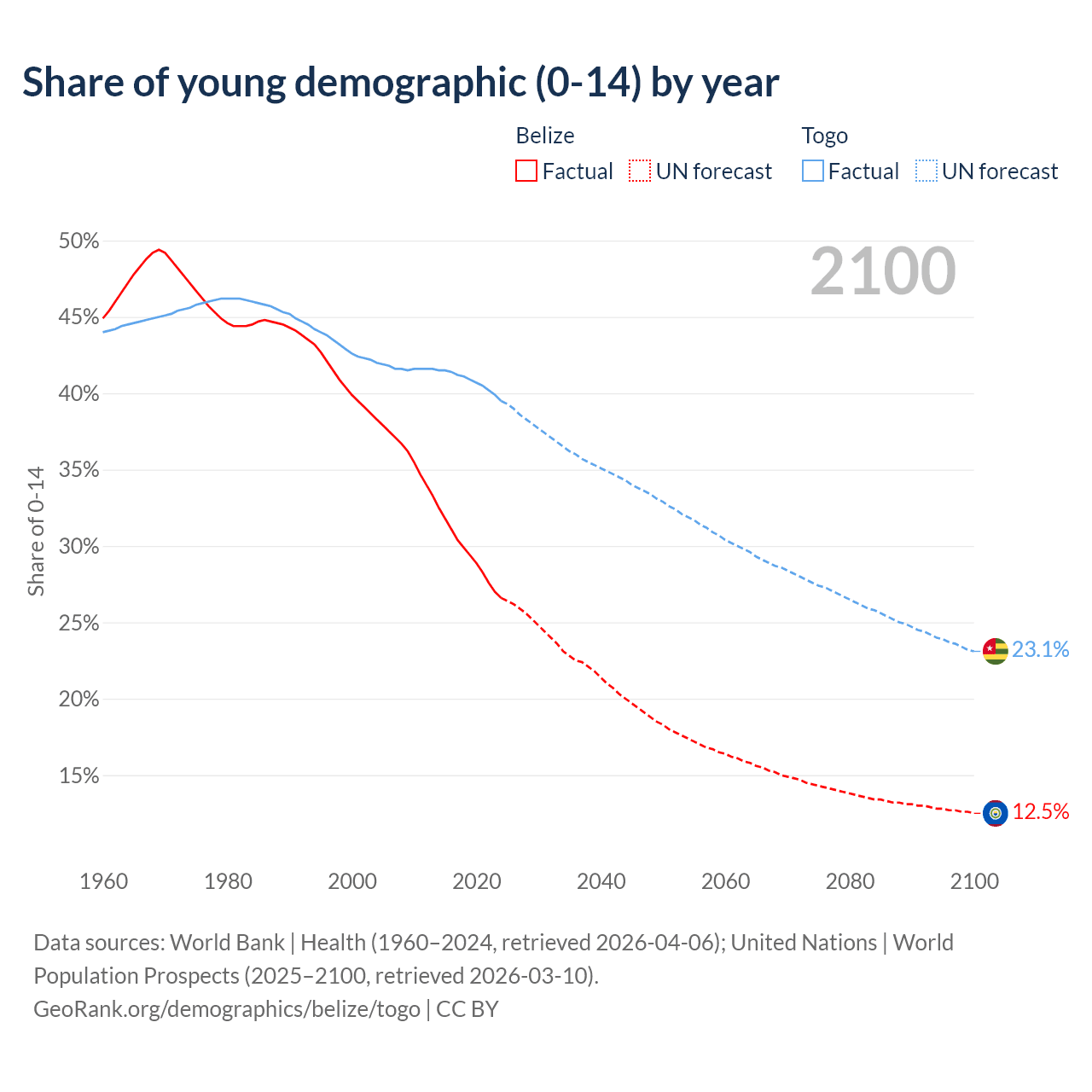 - The share of young demographic (0-15 years old) in Belize is 26.6% vs 39.5% in Togo.