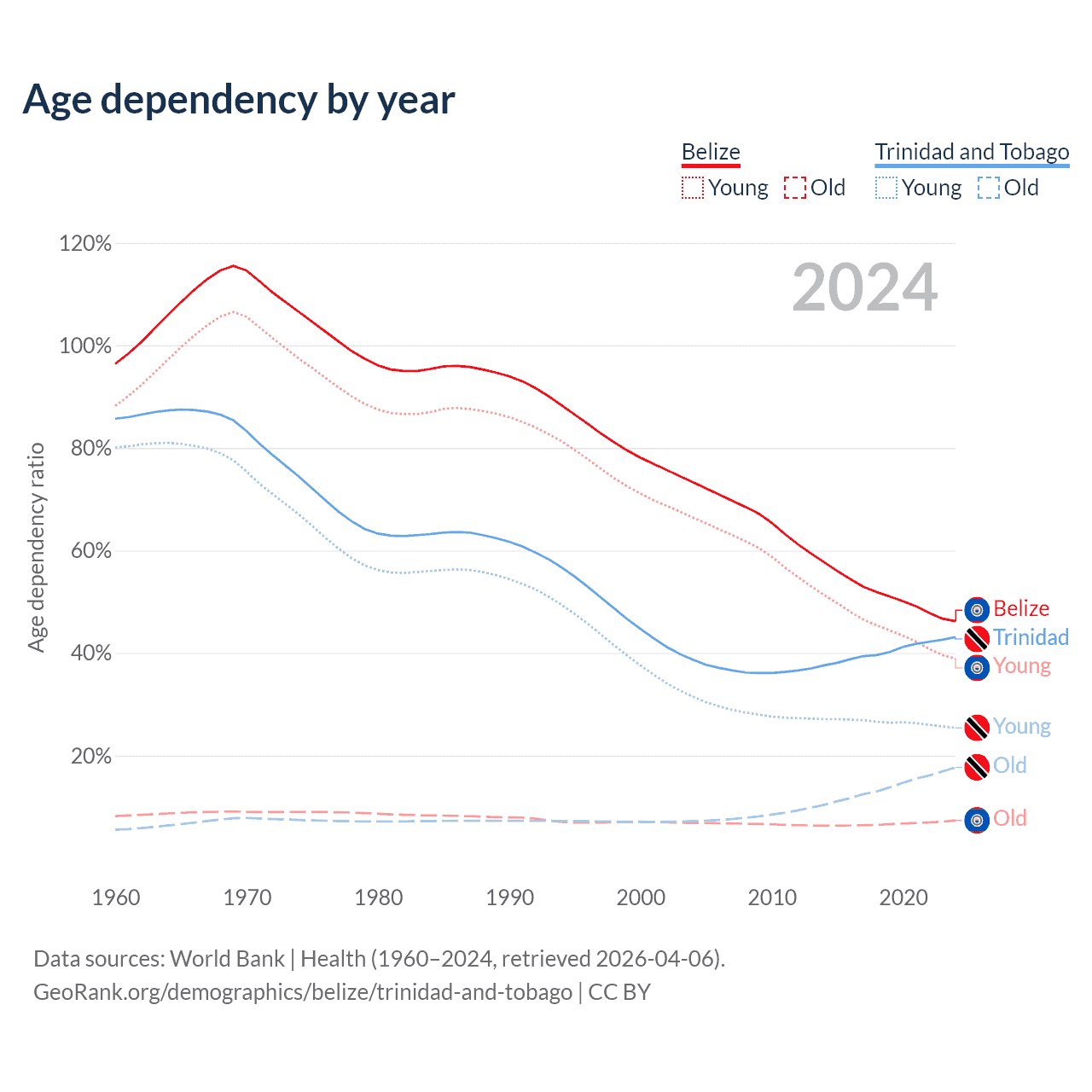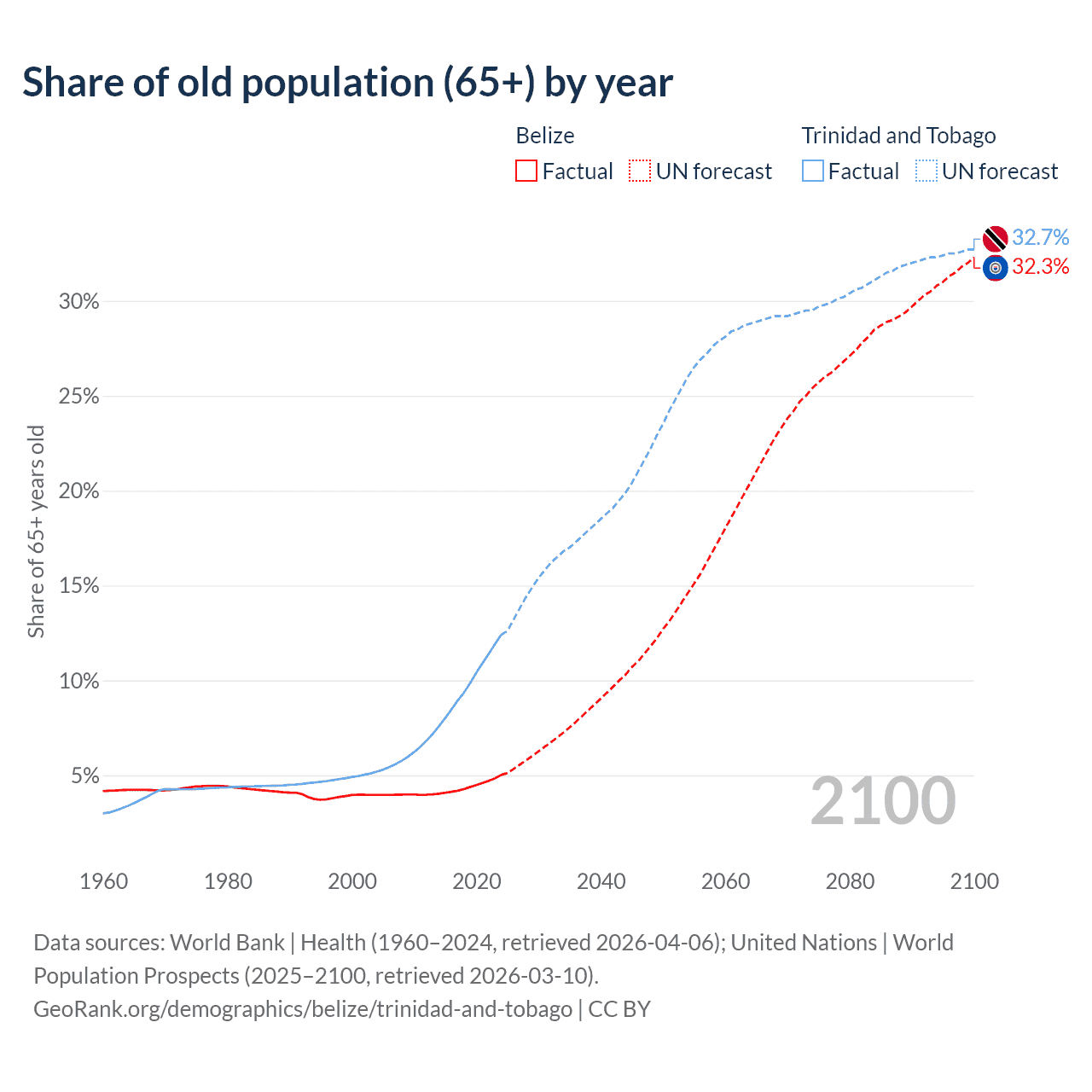 The share of older people aged 65 and over is 5.02% in Belize and 12.4% in Trinidad and Tobago. Life expectancy in Belize compared to Trinidad and Tobago .