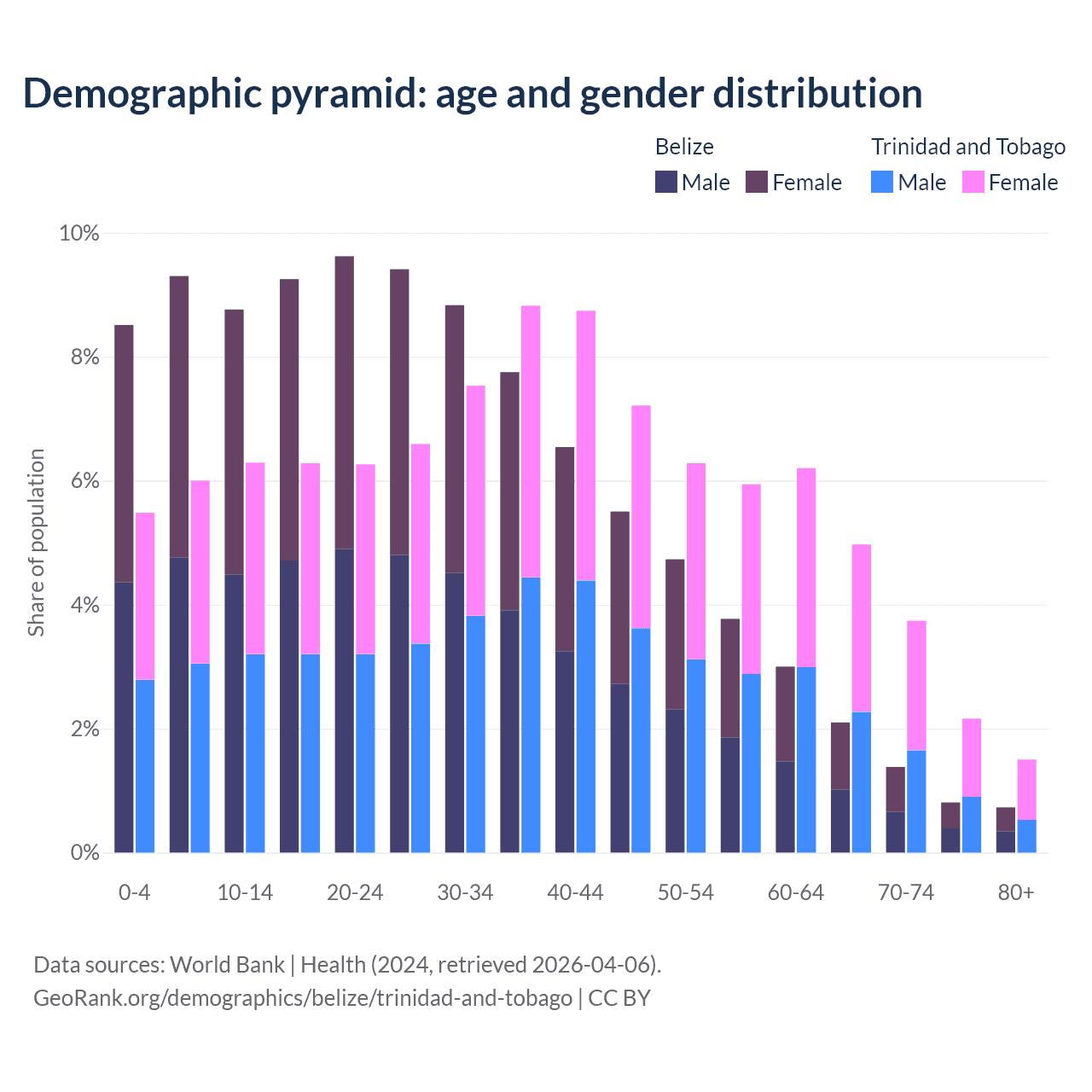 - The share of young demographic (0-15 years old) in Belize is 26.6% vs 17.8% in Trinidad and Tobago.