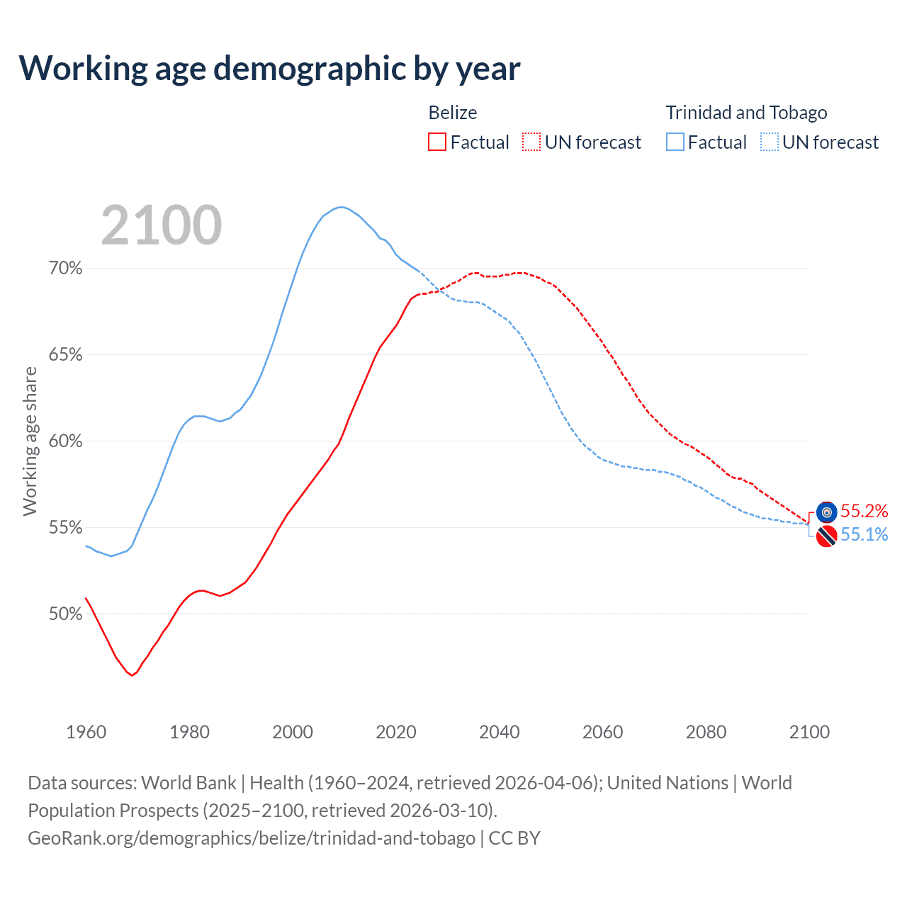 Median age Belize vs Trinidad and Tobago, 1960-2100
