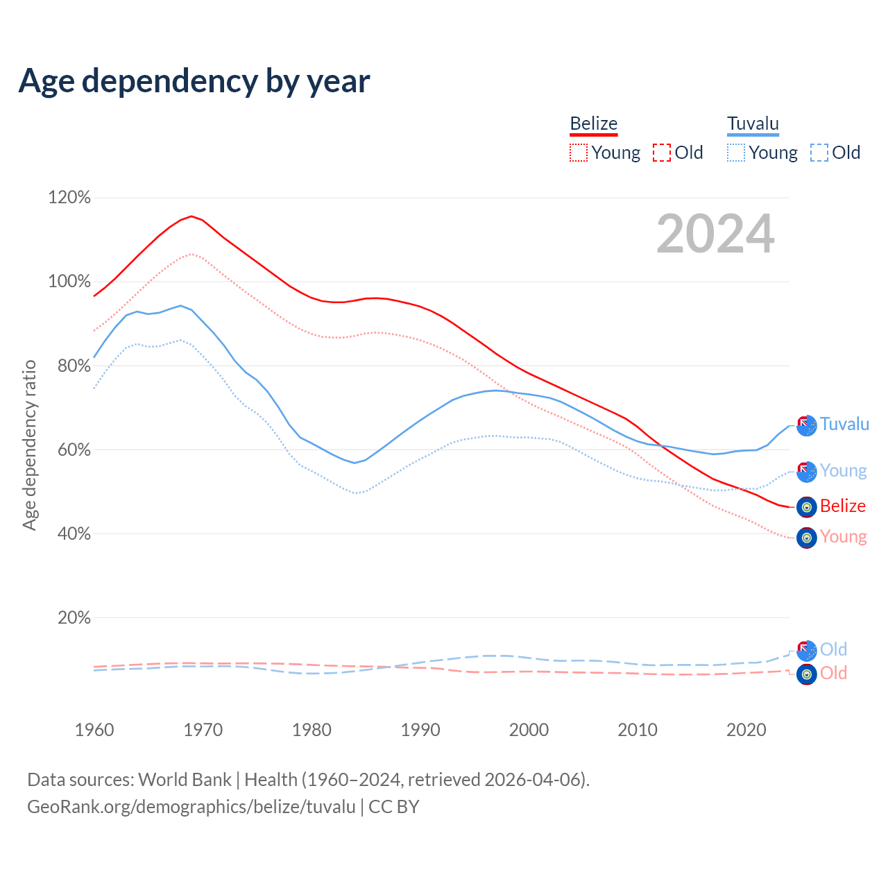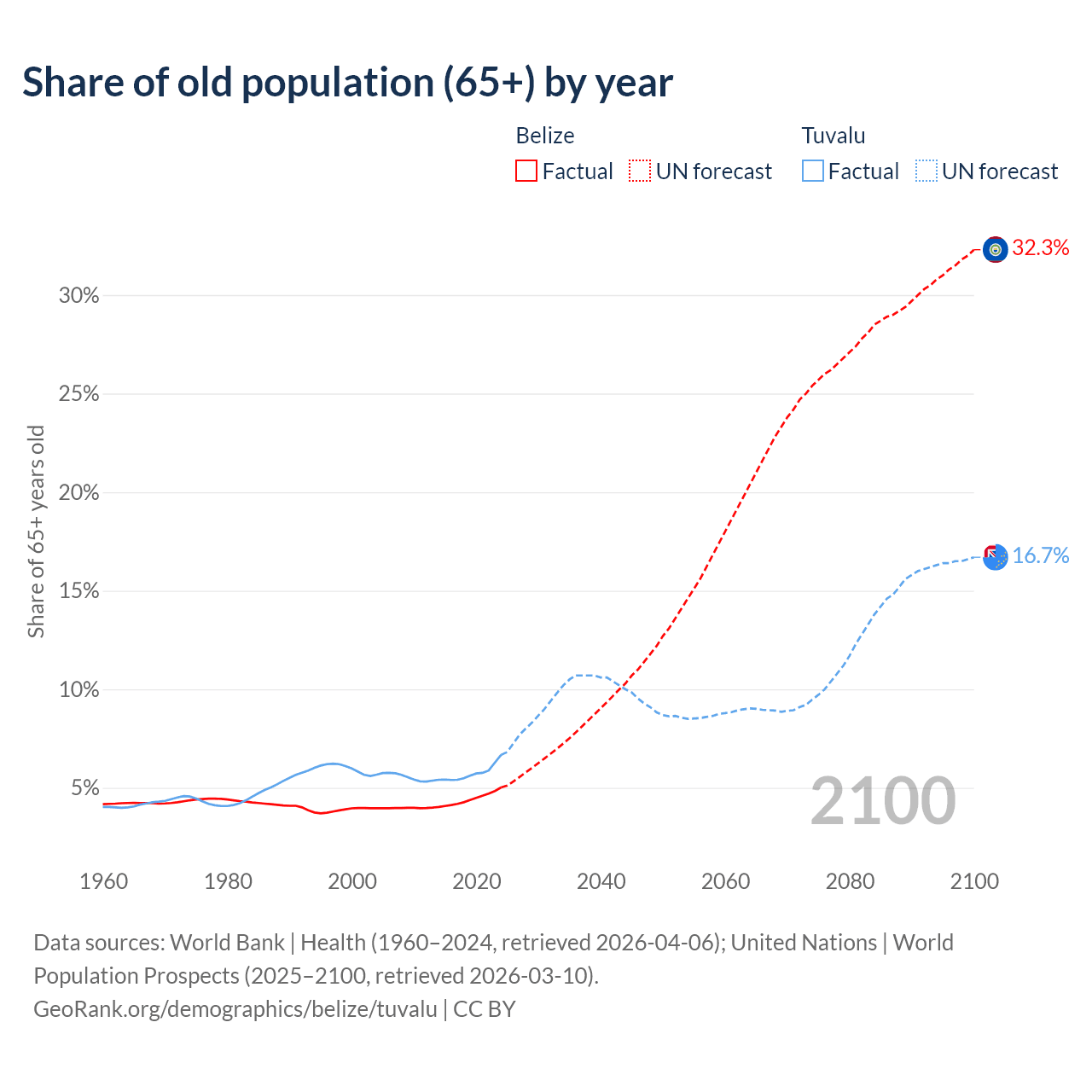 - The share of old-age demographic (65+) in Belize is 5.02% vs 6.67% in Tuvalu.