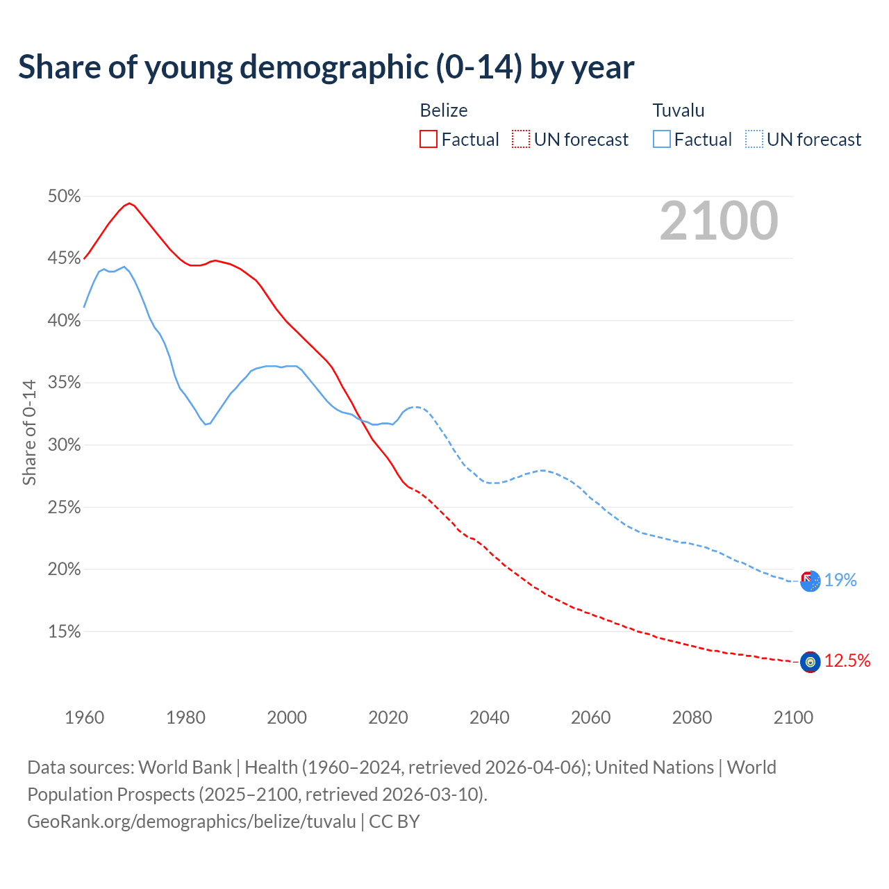 - The share of young demographic (0-15 years old) in Belize is 26.6% vs 32.9% in Tuvalu.