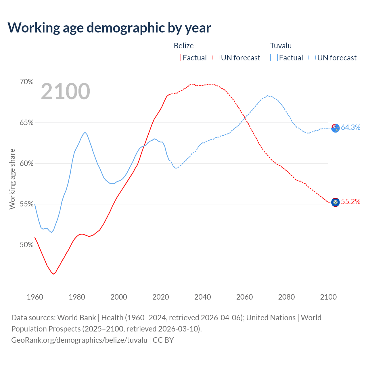 Median age Belize vs Tuvalu, 1960-2100