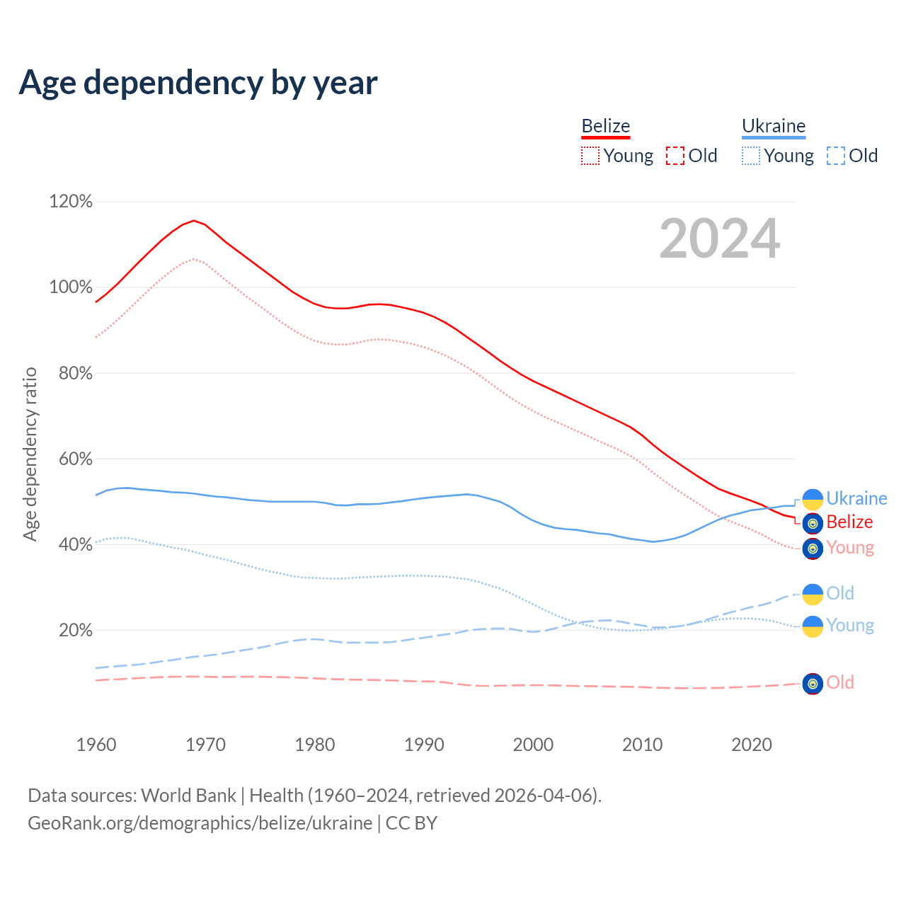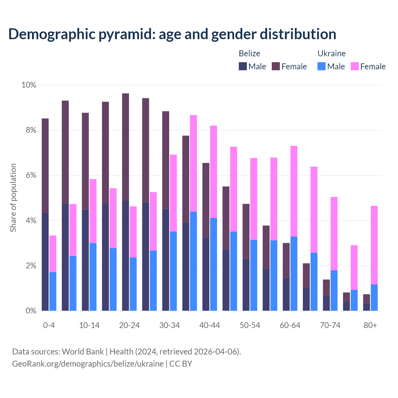 - Belize is ranked 120/196 by median age (oldest to youngest) vs 26/196 for Ukraine.