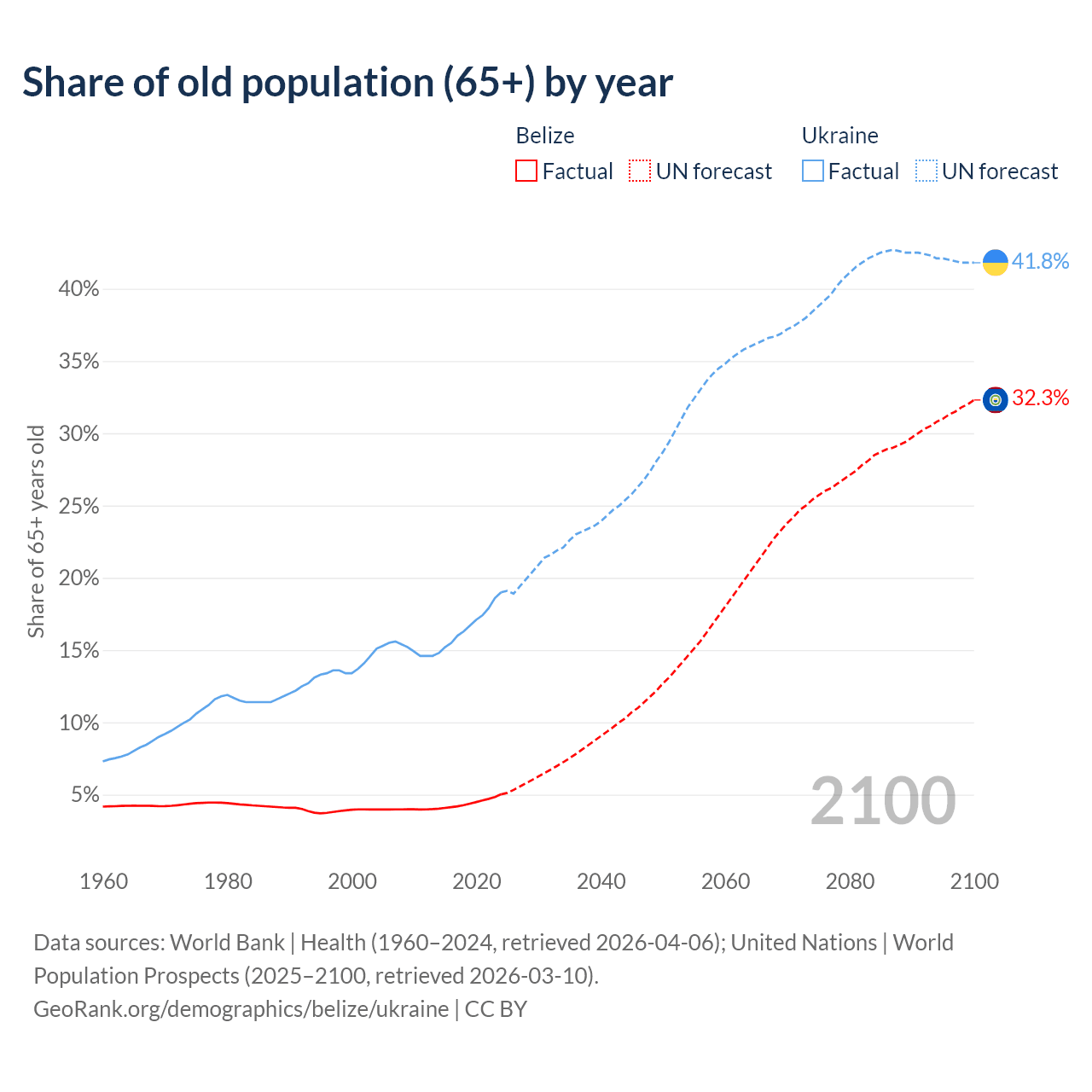 - The share of old-age demographic (65+) in Belize is 5.02% vs 19% in Ukraine.