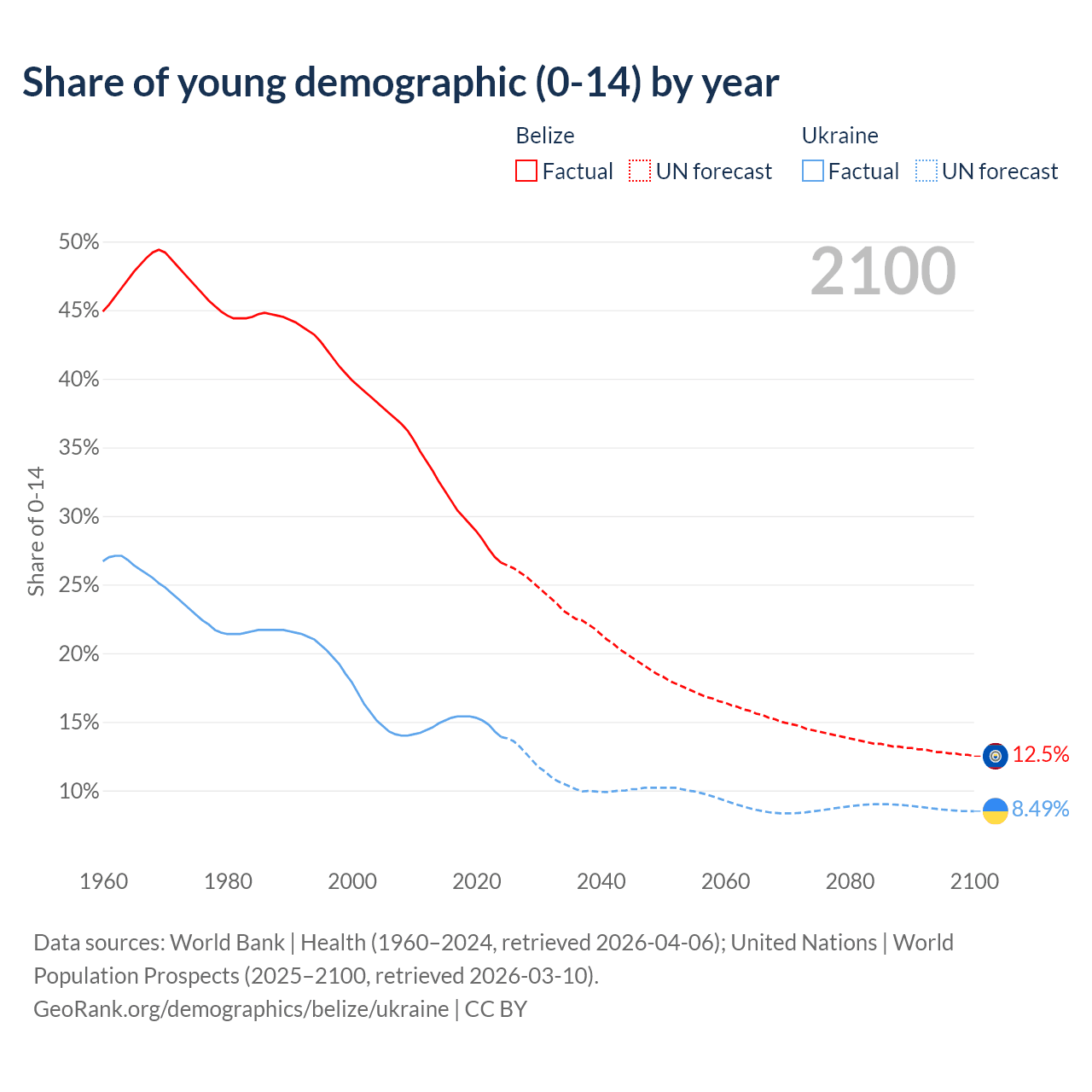 - The share of young demographic (0-15 years old) in Belize is 26.6% vs 13.9% in Ukraine.