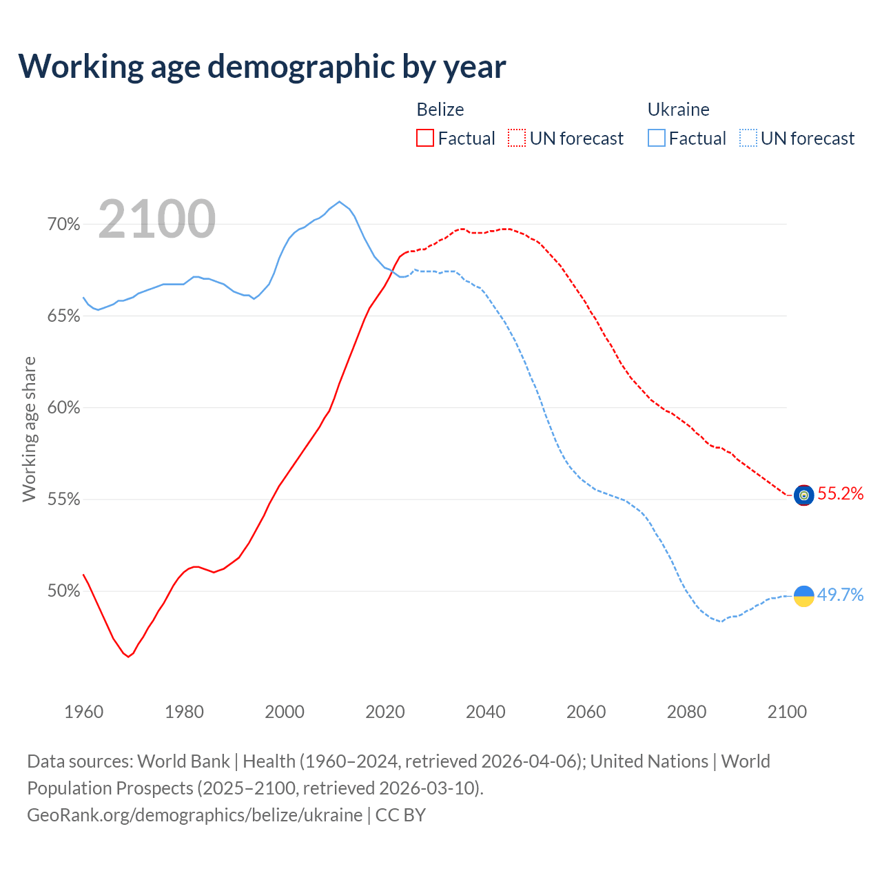- Belize has 294K working age adults (aged 15-64) vs 26.9M in Ukraine.