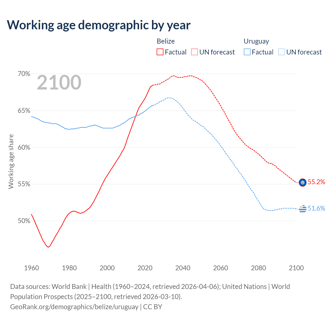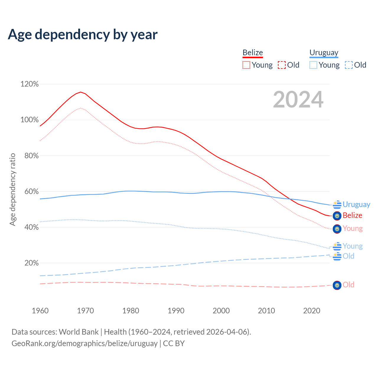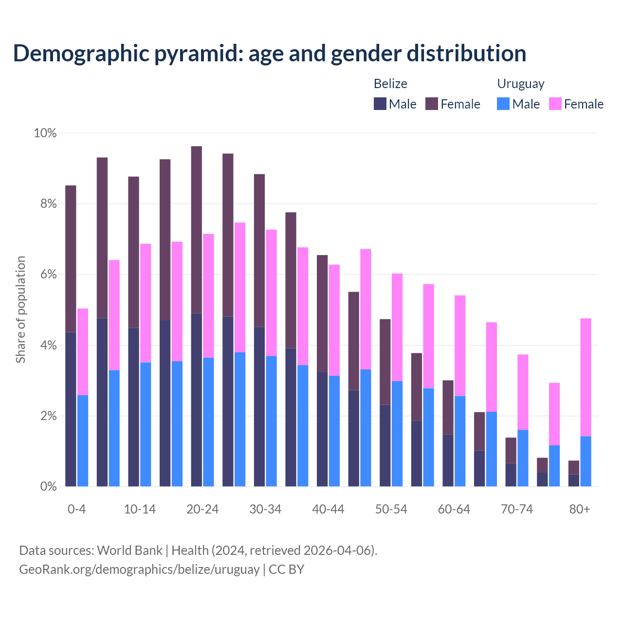 - Belize is ranked 120/196 by median age (oldest to youngest) vs 63/196 for Uruguay.