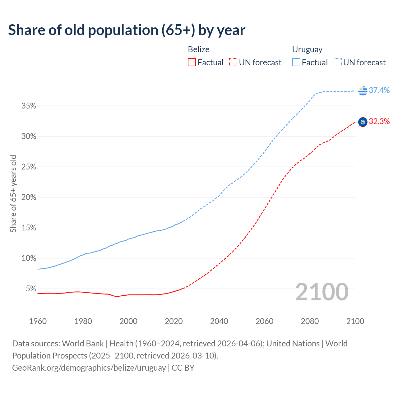 The share of older people aged 65 and over is 5.02% in Belize and 16% in Uruguay. Life expectancy in Belize compared to Uruguay .