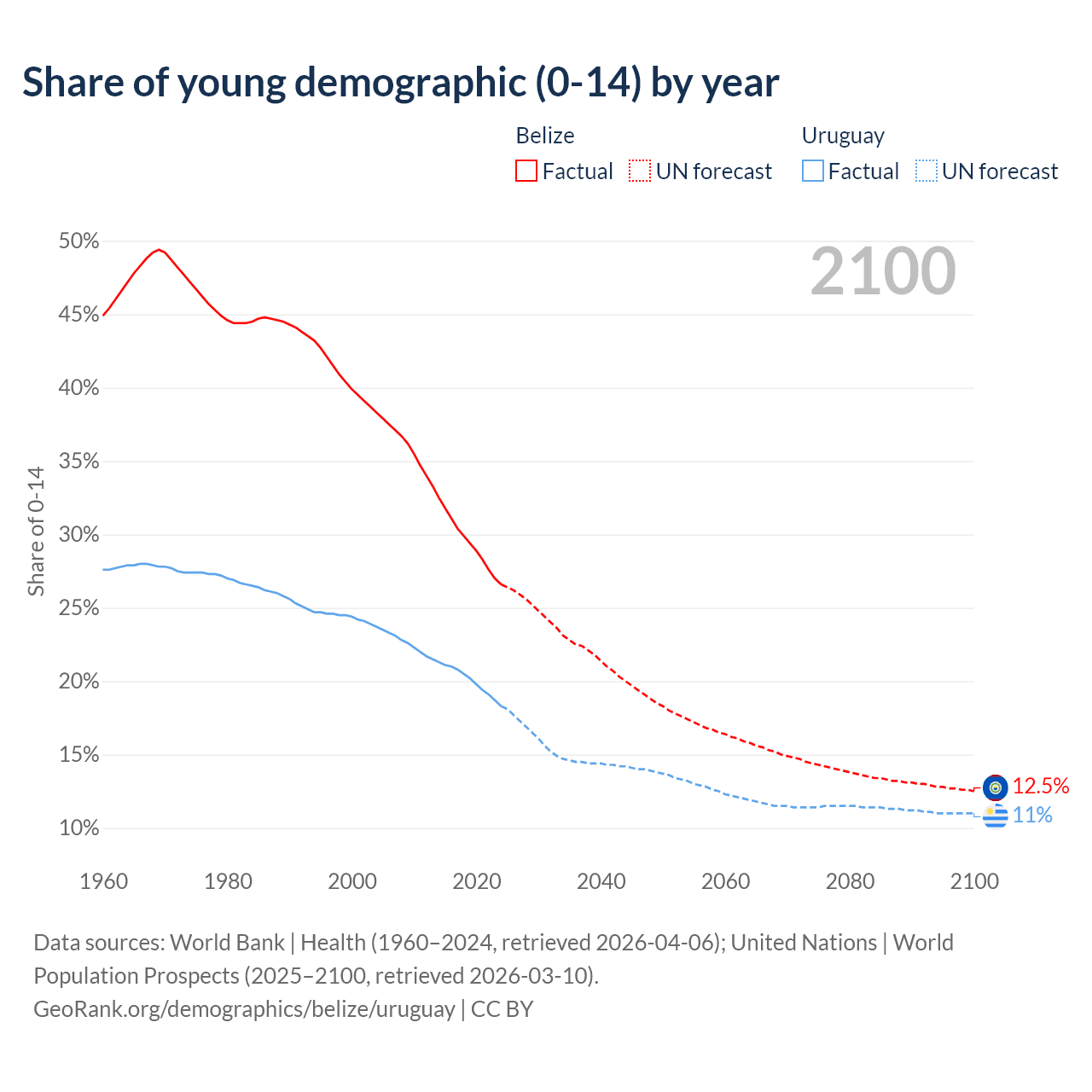 - The share of young demographic (0-15 years old) in Belize is 26.6% vs 18.3% in Uruguay.