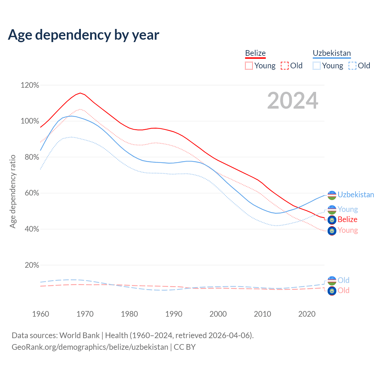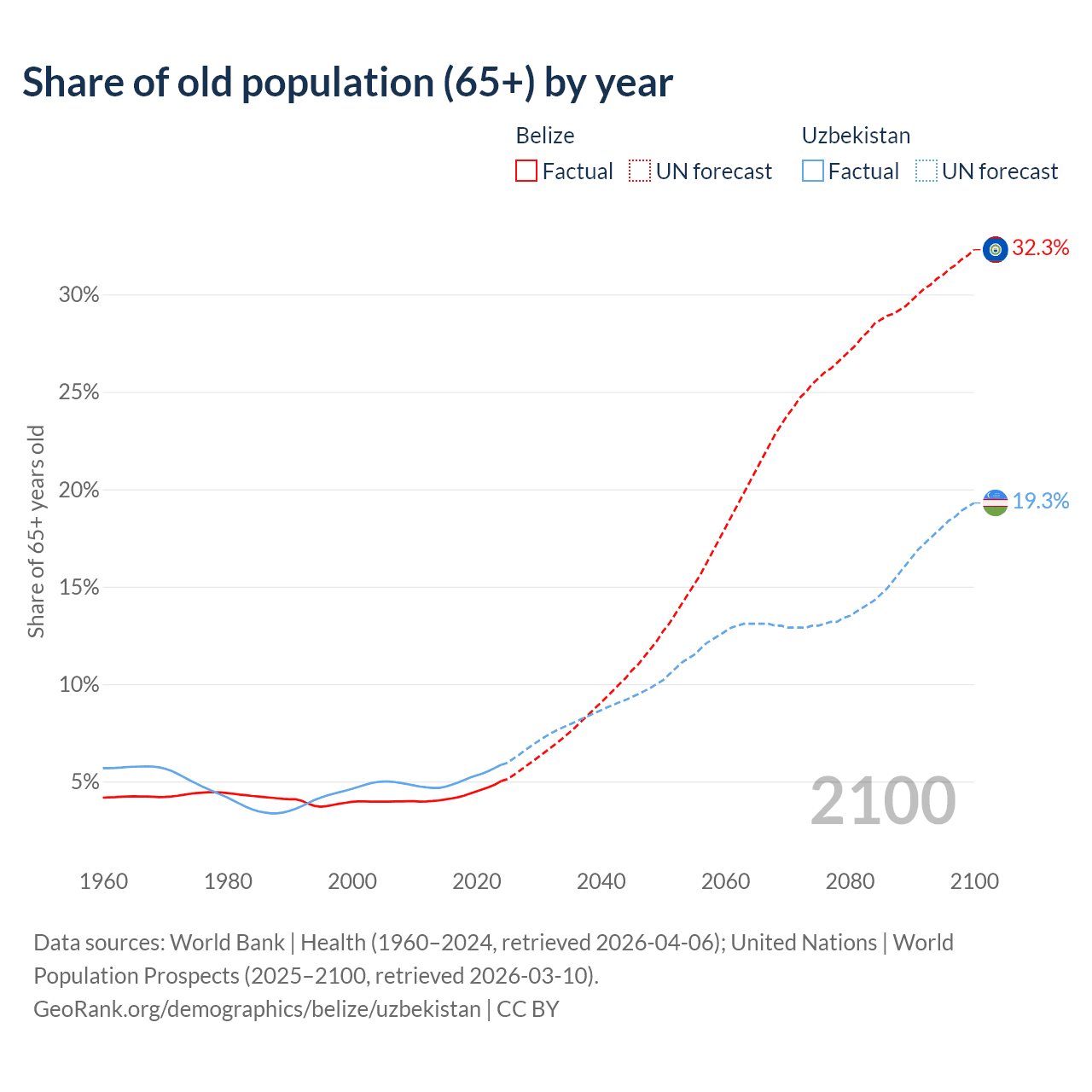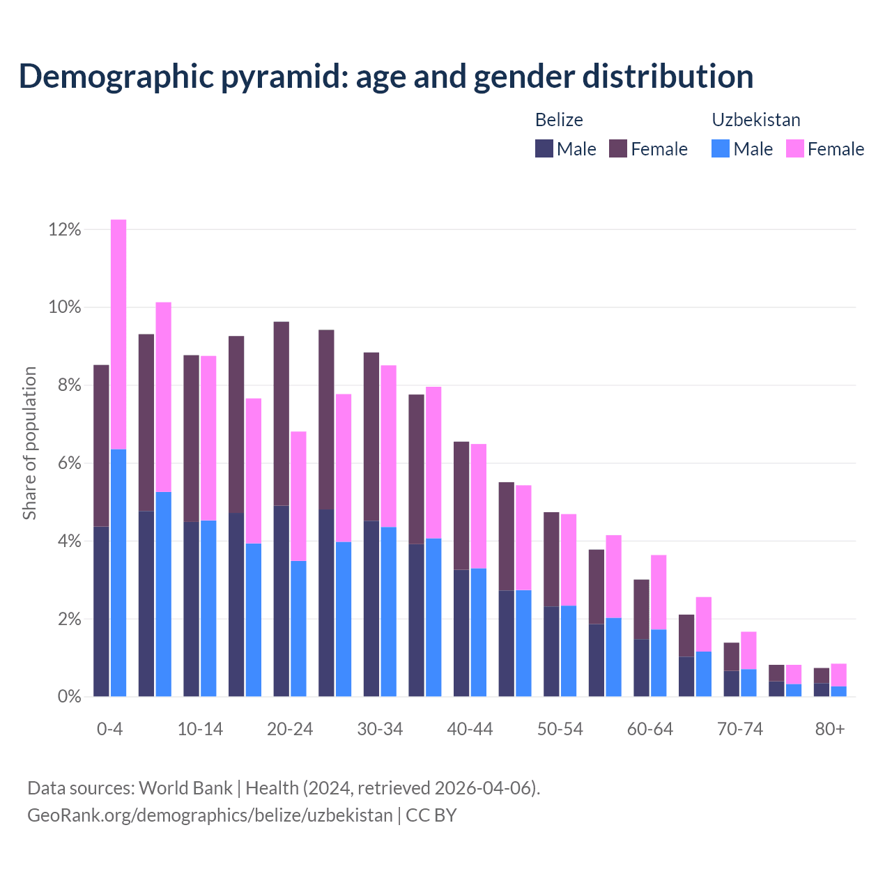 - The share of old-age demographic (65+) in Belize is 5.02% vs 5.86% in Uzbekistan.