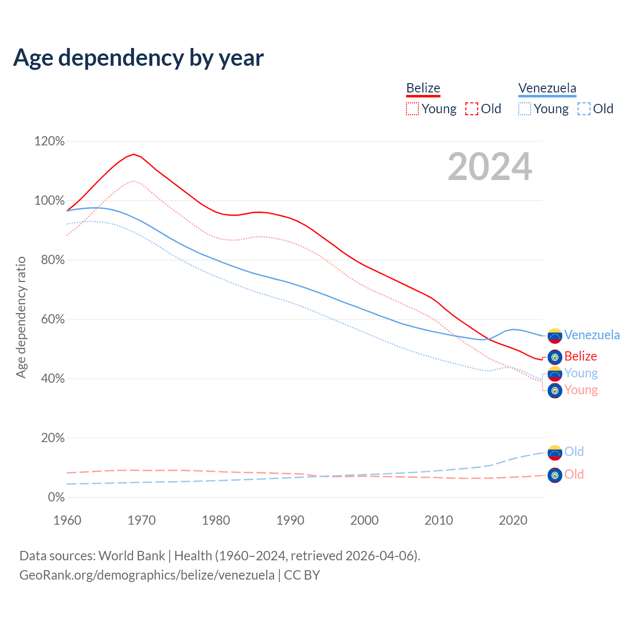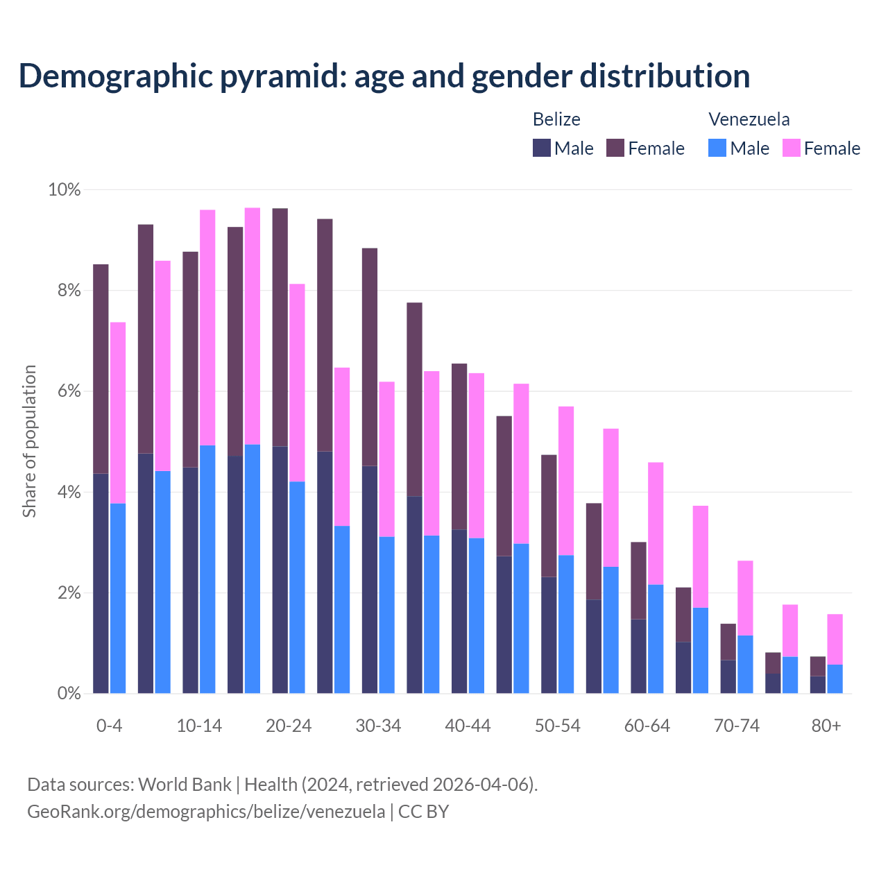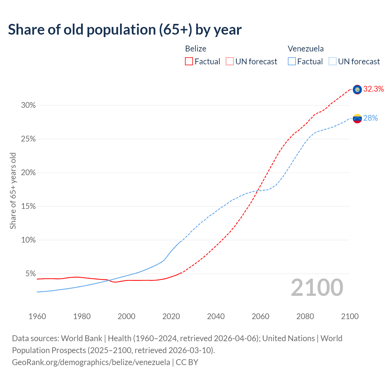 - The share of old-age demographic (65+) in Belize is 5.02% vs 9.68% in Venezuela.