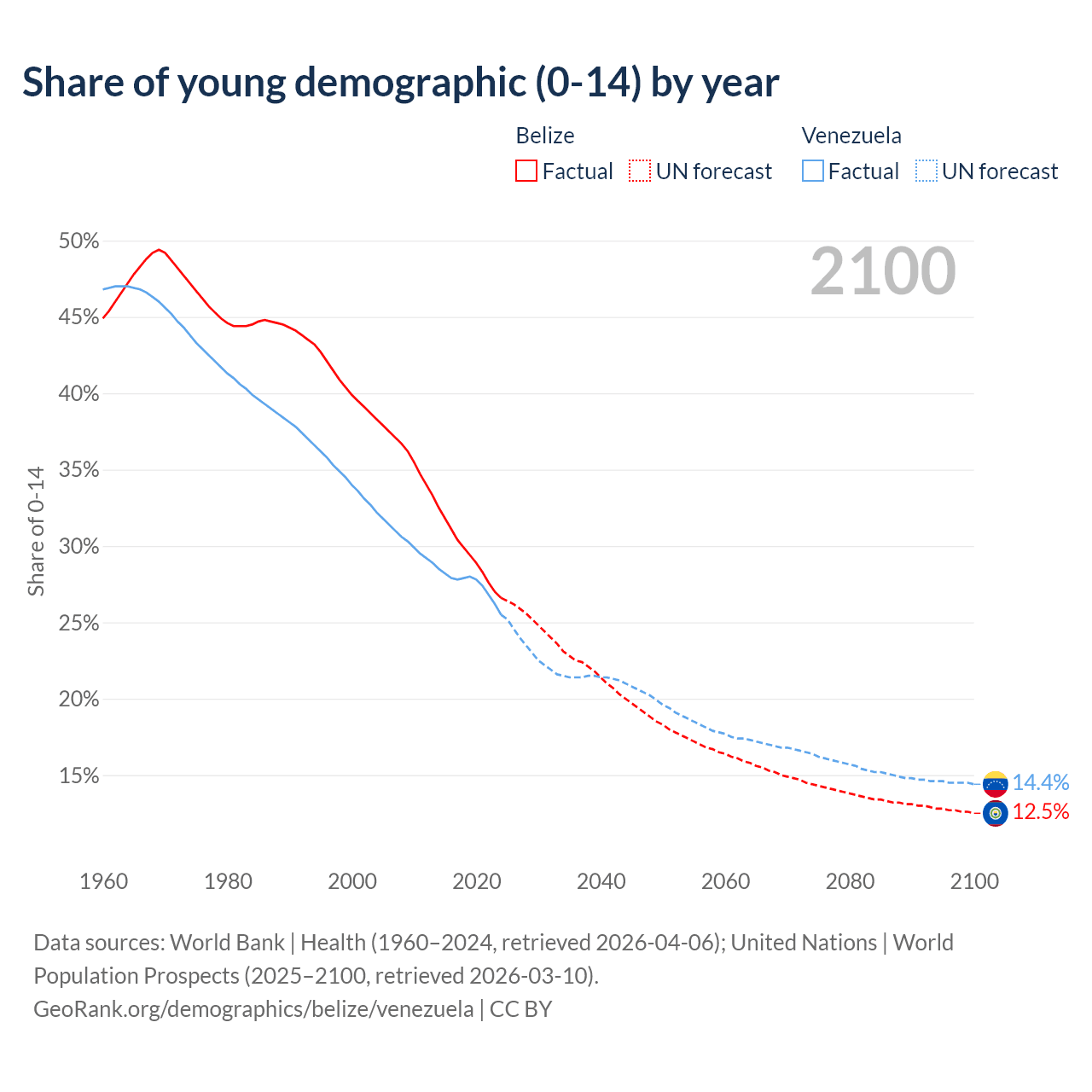 - The share of young demographic (0-15 years old) in Belize is 26.6% vs 25.5% in Venezuela.