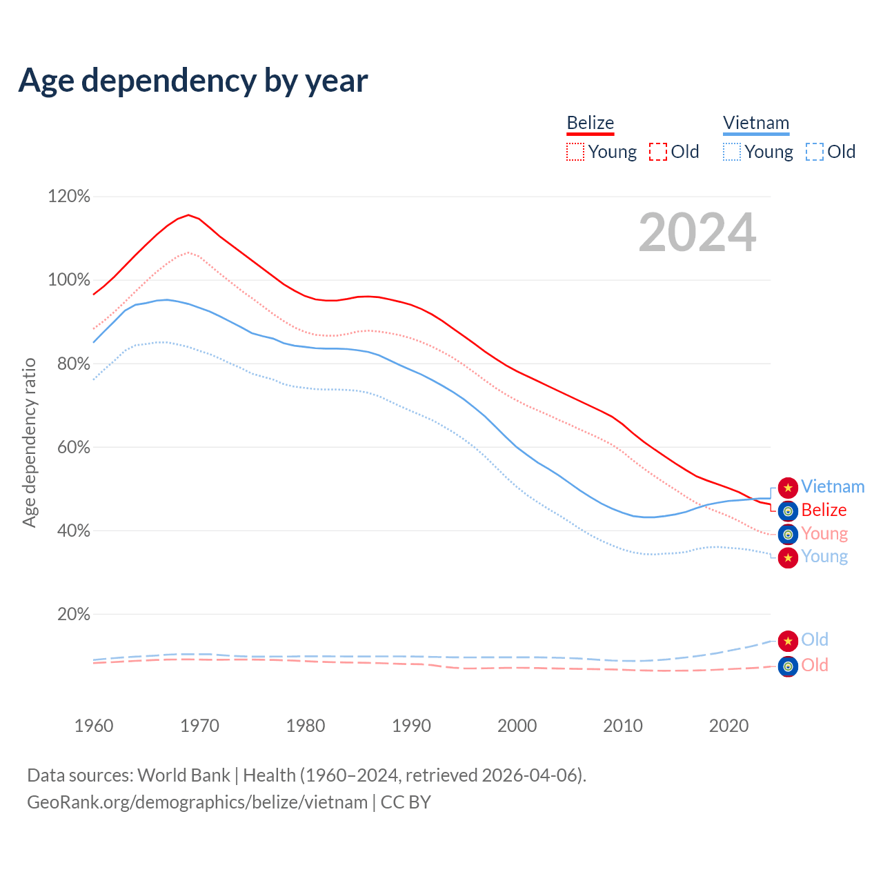 - Belize is ranked 120/196 by median age (oldest to youngest) vs 84/196 for Vietnam.