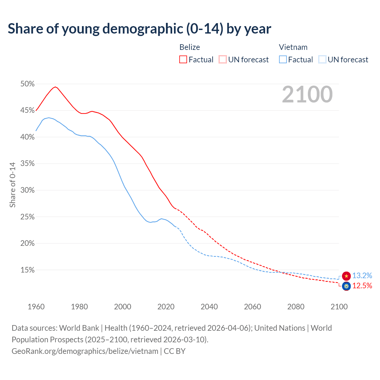 - The share of young demographic (0-15 years old) in Belize is 26.6% vs 23.2% in Vietnam.