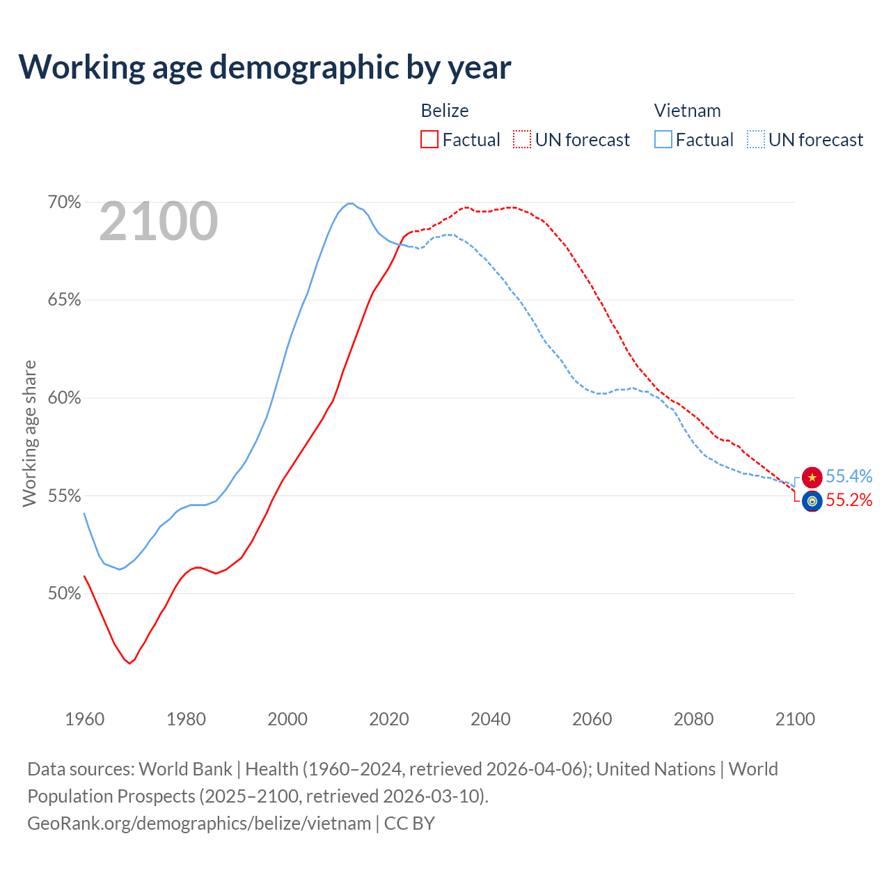 - Belize has 294K working age adults (aged 15-64) vs 69.3M in Vietnam.