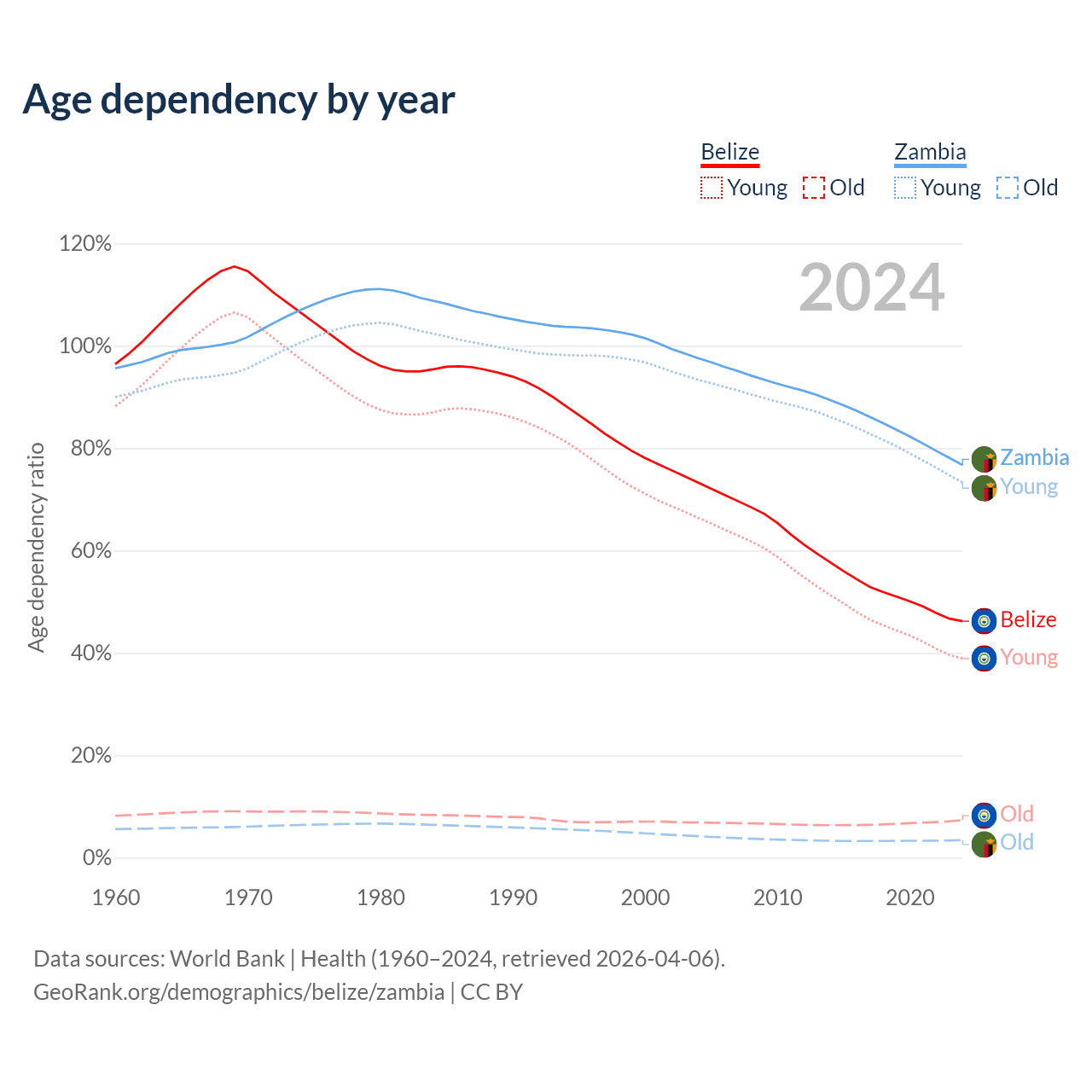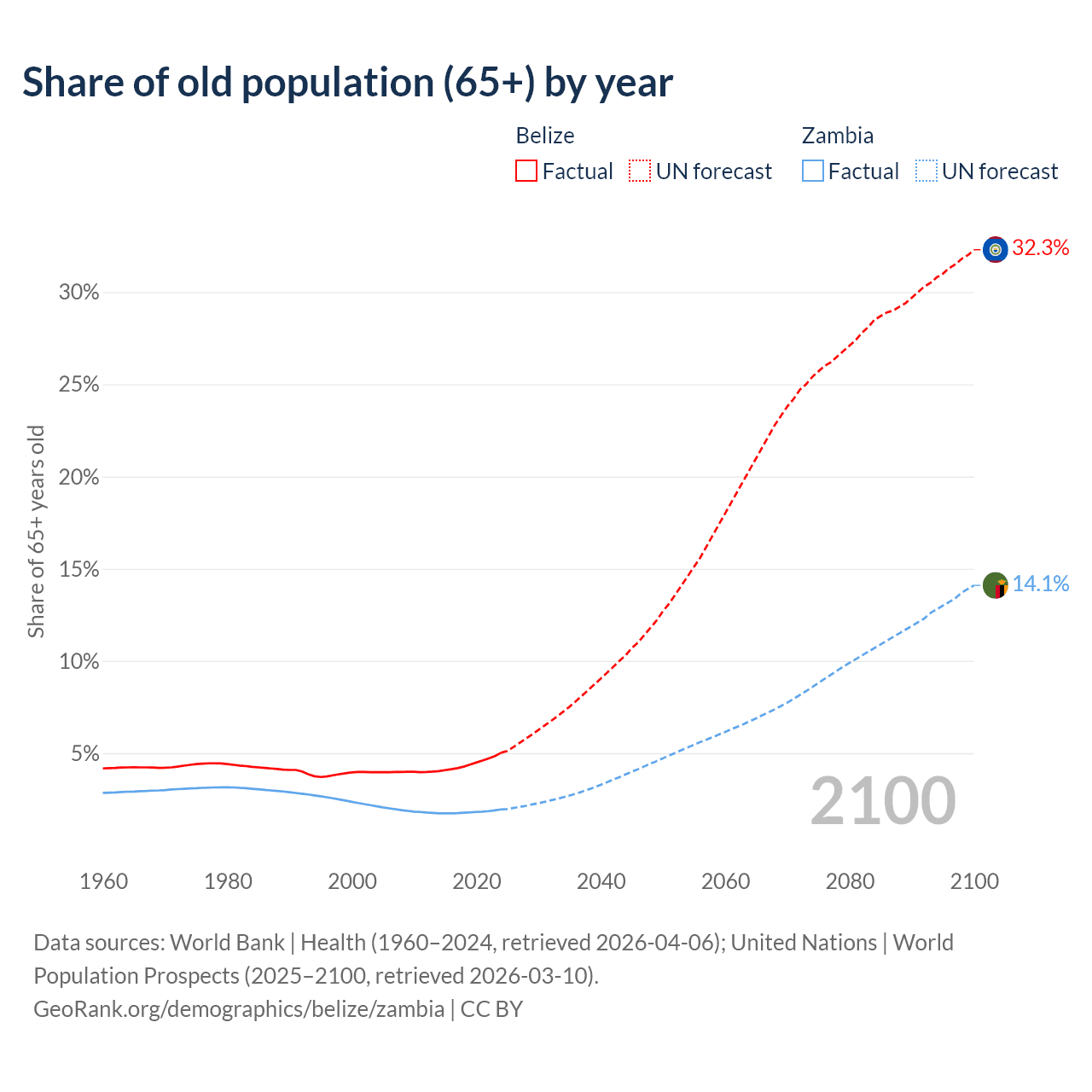 - The share of old-age demographic (65+) in Belize is 5.02% vs 1.95% in Zambia.