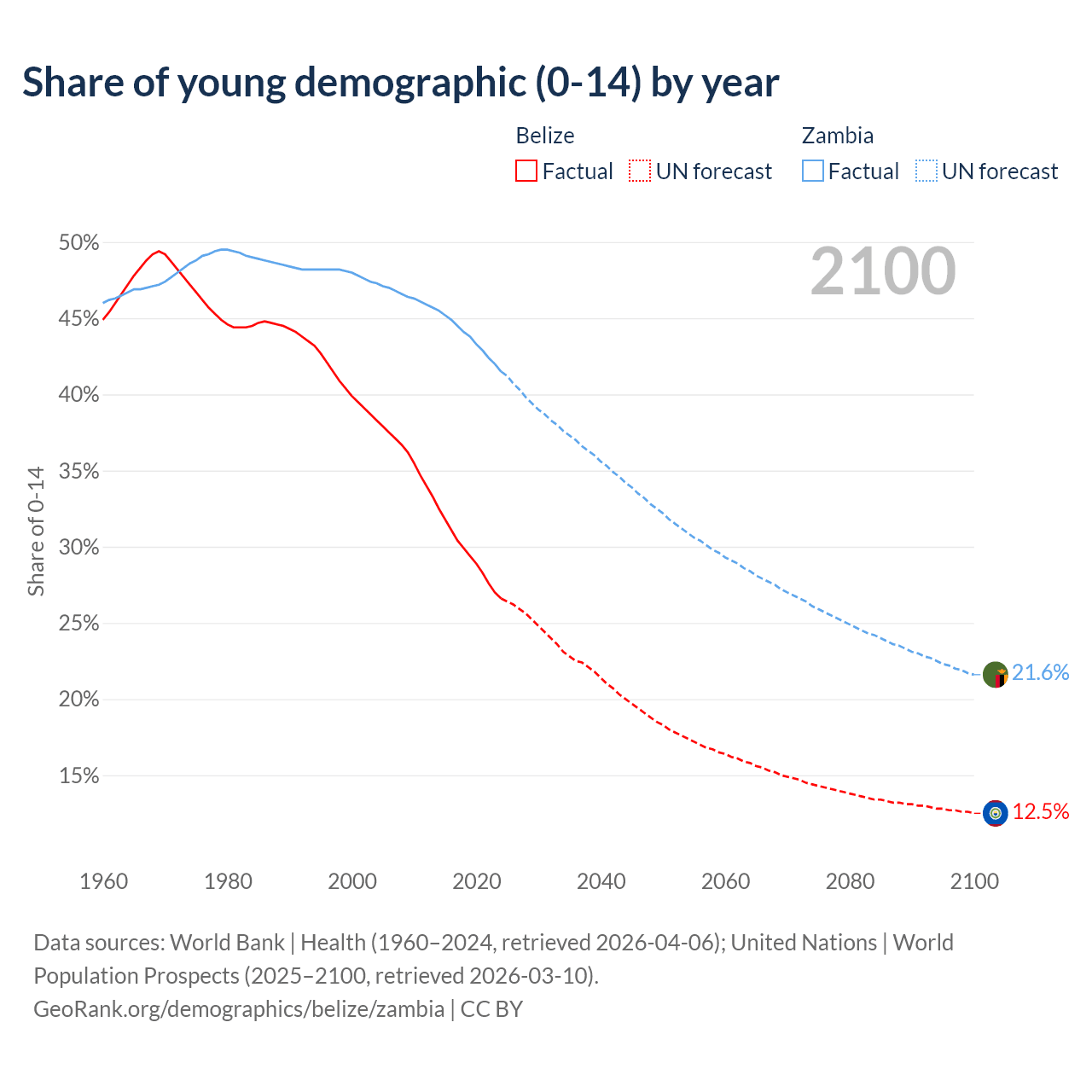 - The share of young demographic (0-15 years old) in Belize is 26.6% vs 41.5% in Zambia.