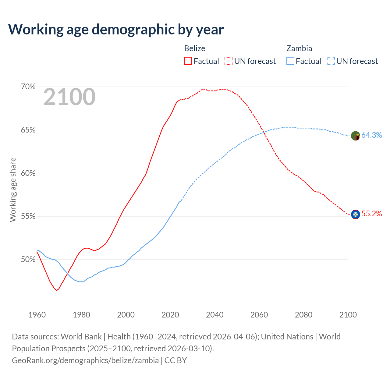Median age Belize vs Zambia, 1960-2100