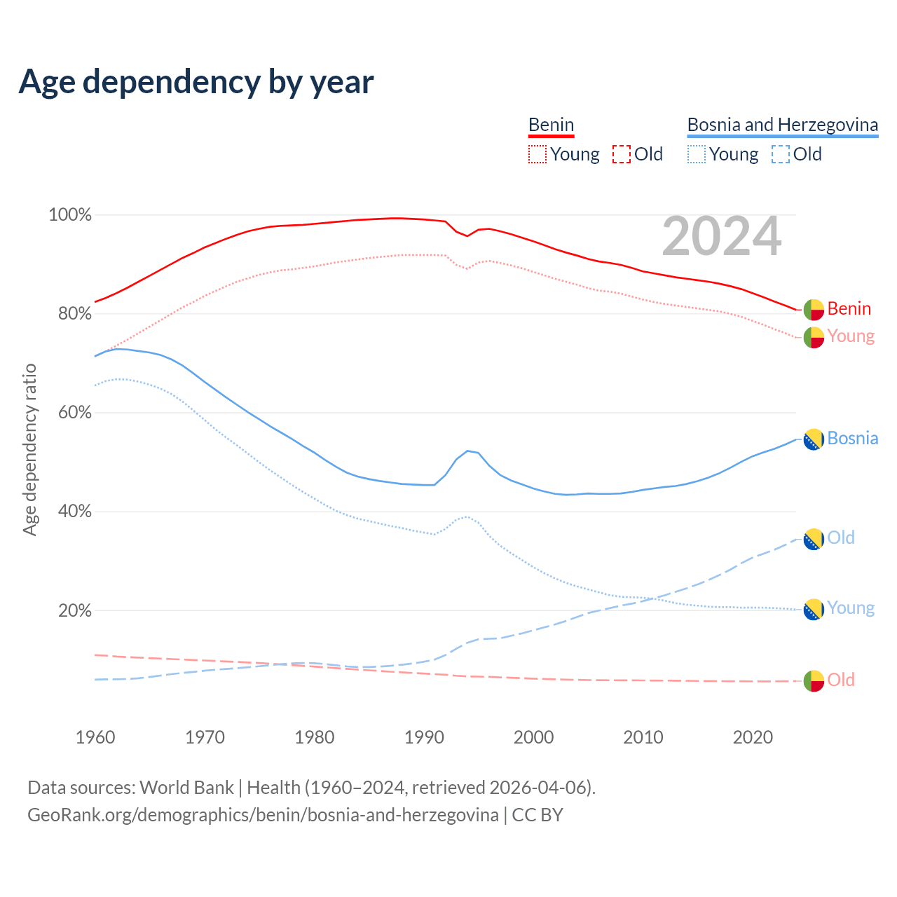 - Benin is ranked 179/196 by median age (oldest to youngest) vs 8/196 for Bosnia and Herzegovina.