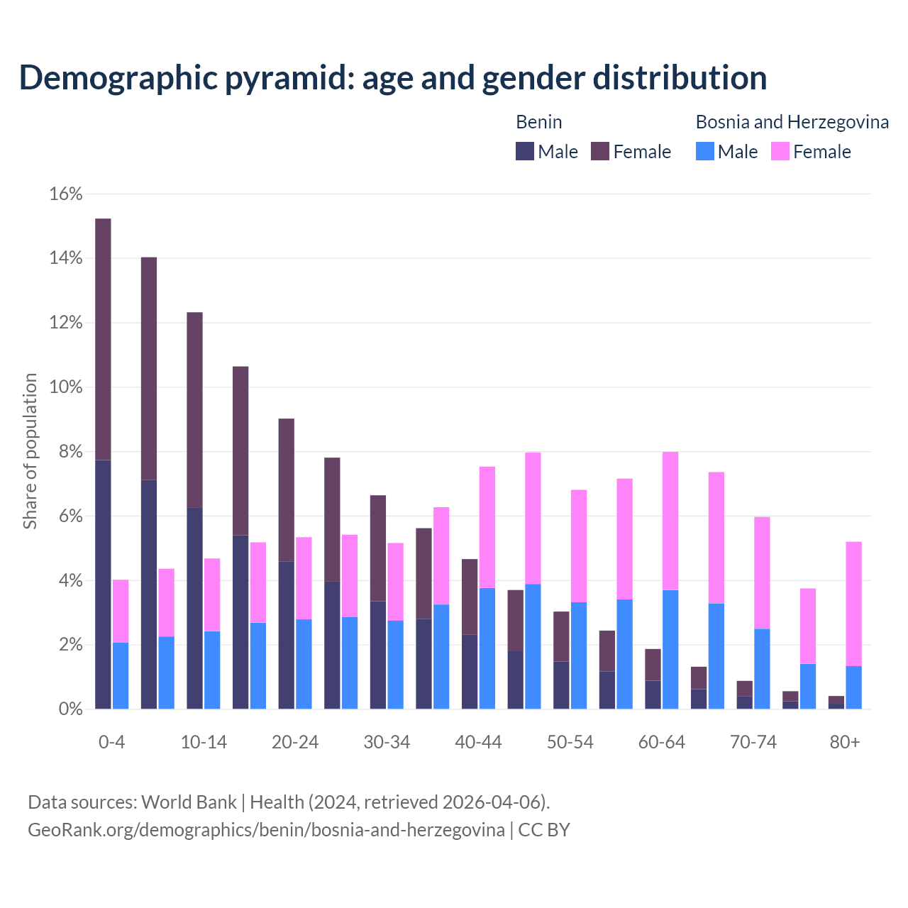 - As of 2026, the population of Benin is 15.3M vs 3.12M in Bosnia and Herzegovina - 4.9 times difference.