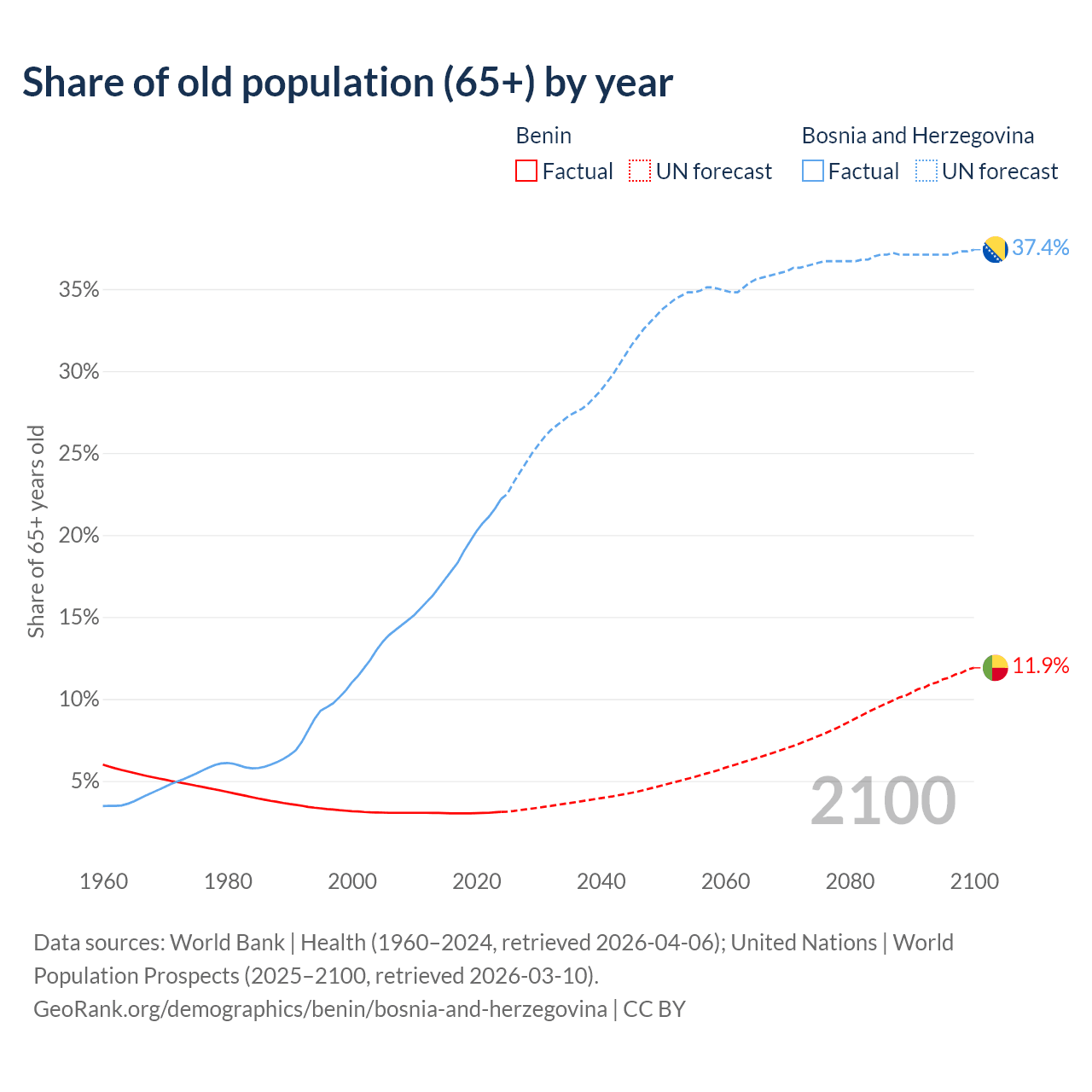 - The share of old-age demographic (65+) in Benin is 3.12% vs 22.2% in Bosnia and Herzegovina.