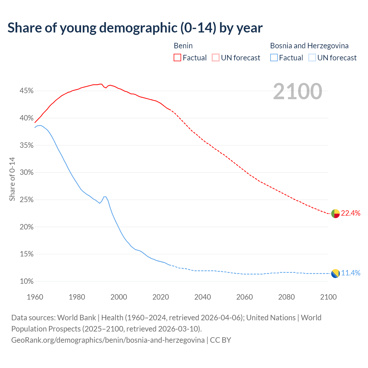 - The share of young demographic (0-15 years old) in Benin is 41.6% vs 13% in Bosnia and Herzegovina.