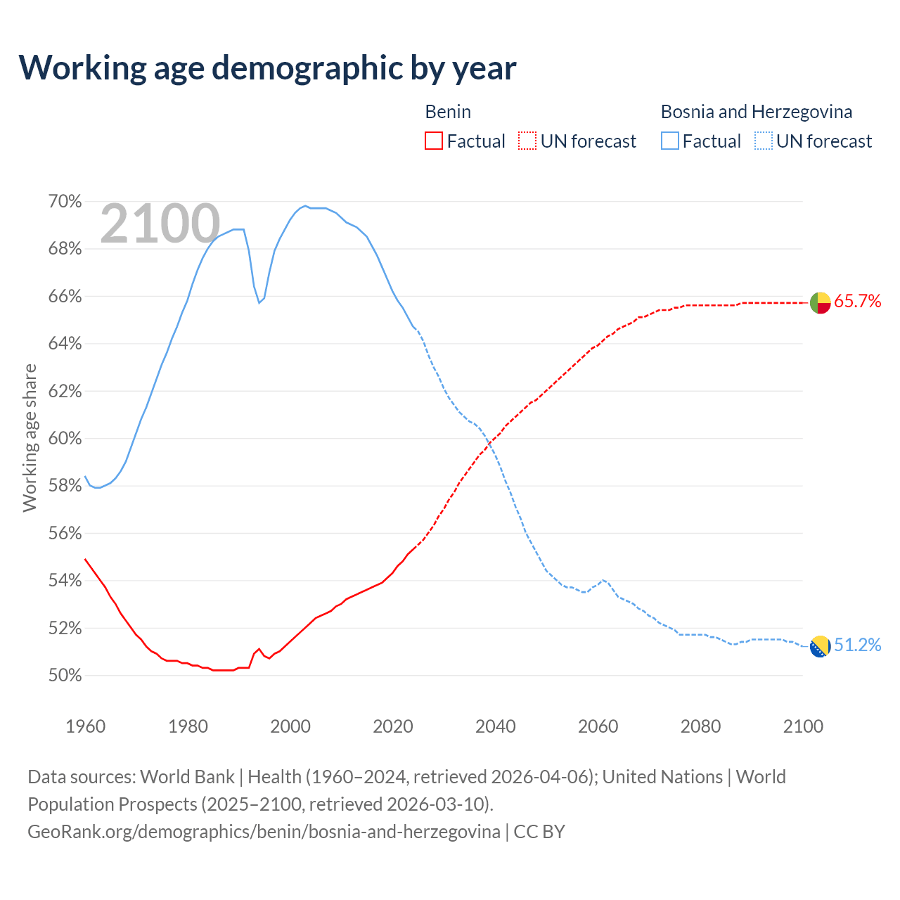 - Benin has 8.45M working age adults (aged 15-64) vs 2.02M in Bosnia and Herzegovina.