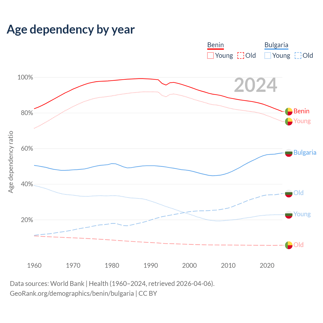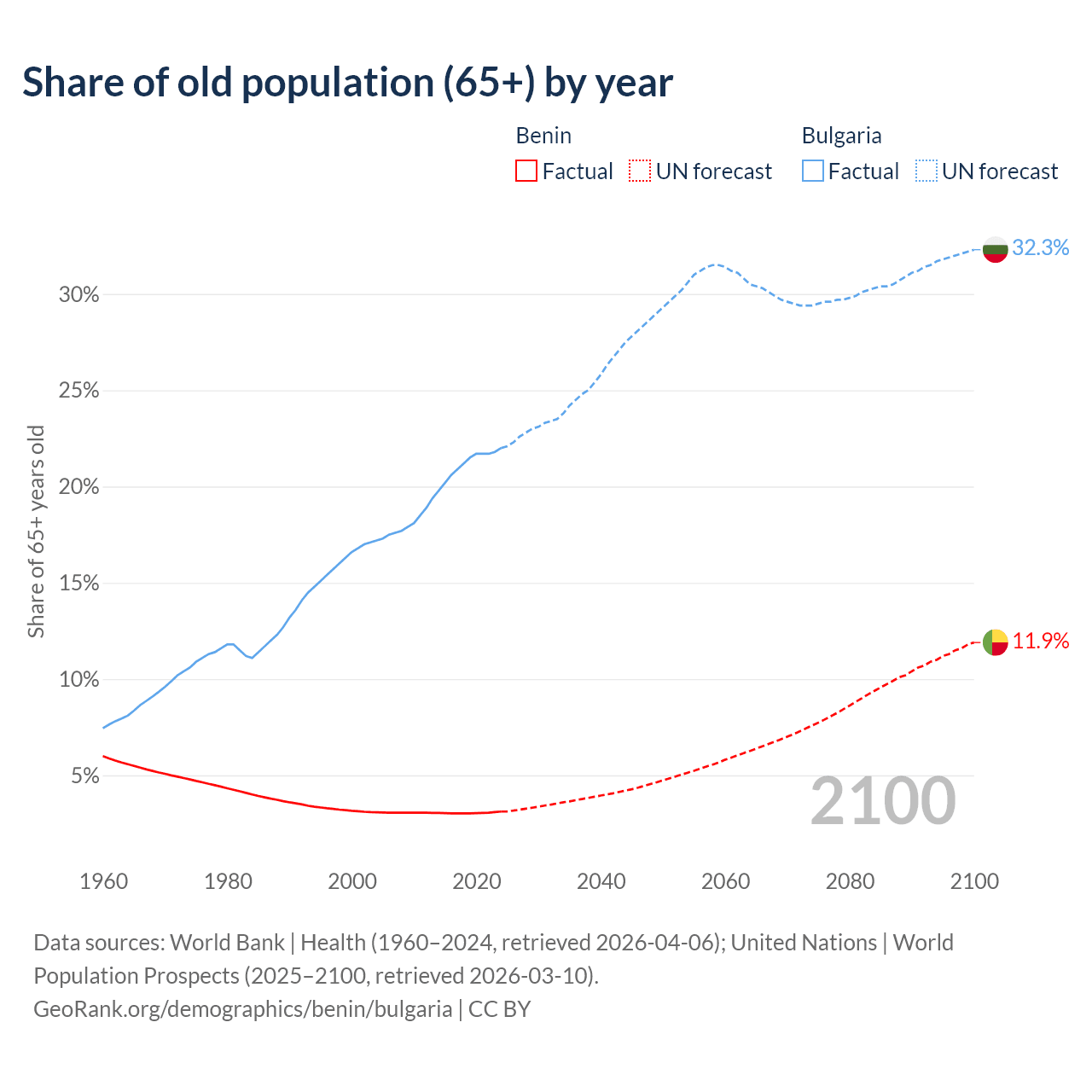 The share of older people aged 65 and over is 3.12% in Benin and 22% in Bulgaria. Life expectancy in Benin compared to Bulgaria .