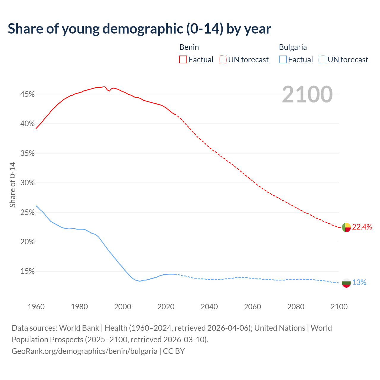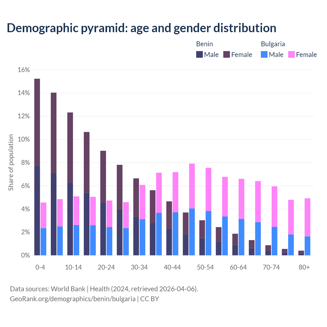 - The share of young demographic (0-15 years old) in Benin is 41.6% vs 14.5% in Bulgaria.