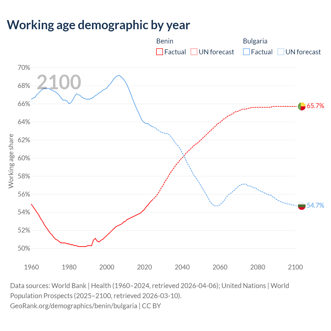 Median age Benin vs Bulgaria, 1960-2100