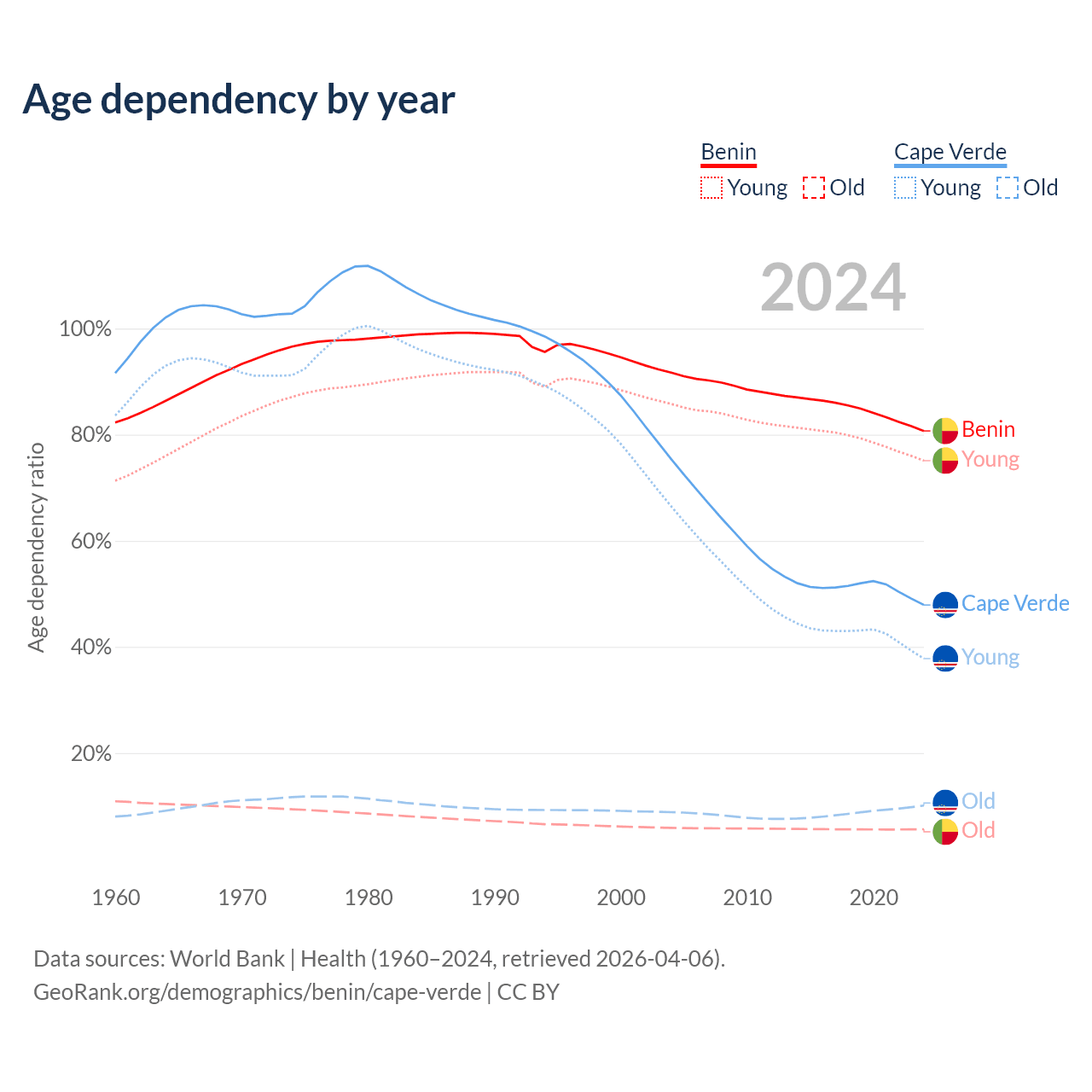 - The share of old-age demographic (65+) in Benin is 3.12% vs 6.86% in Cape Verde.