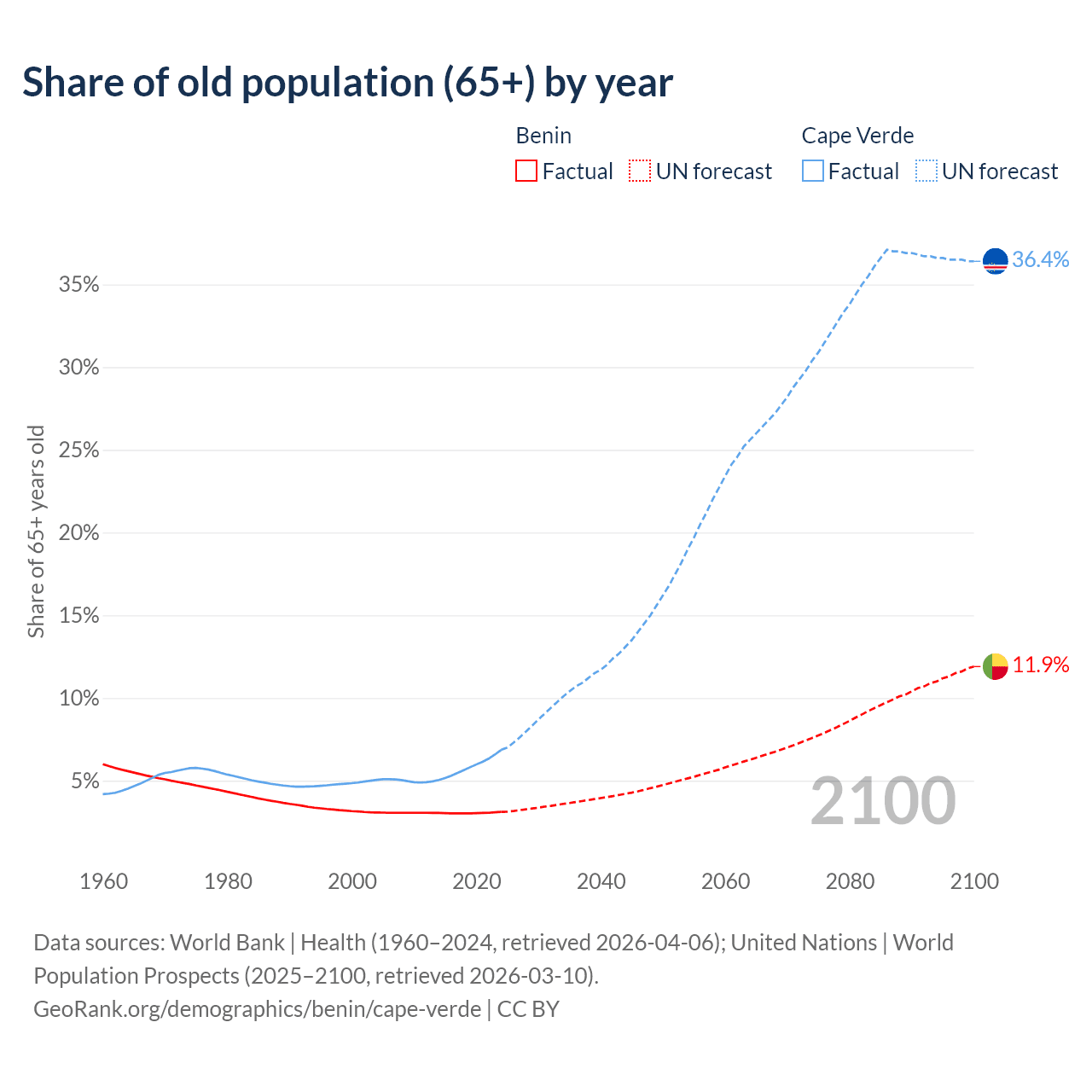 The share of older people aged 65 and over is 3.12% in Benin and 6.86% in Cape Verde. Life expectancy in Benin compared to Cape Verde .