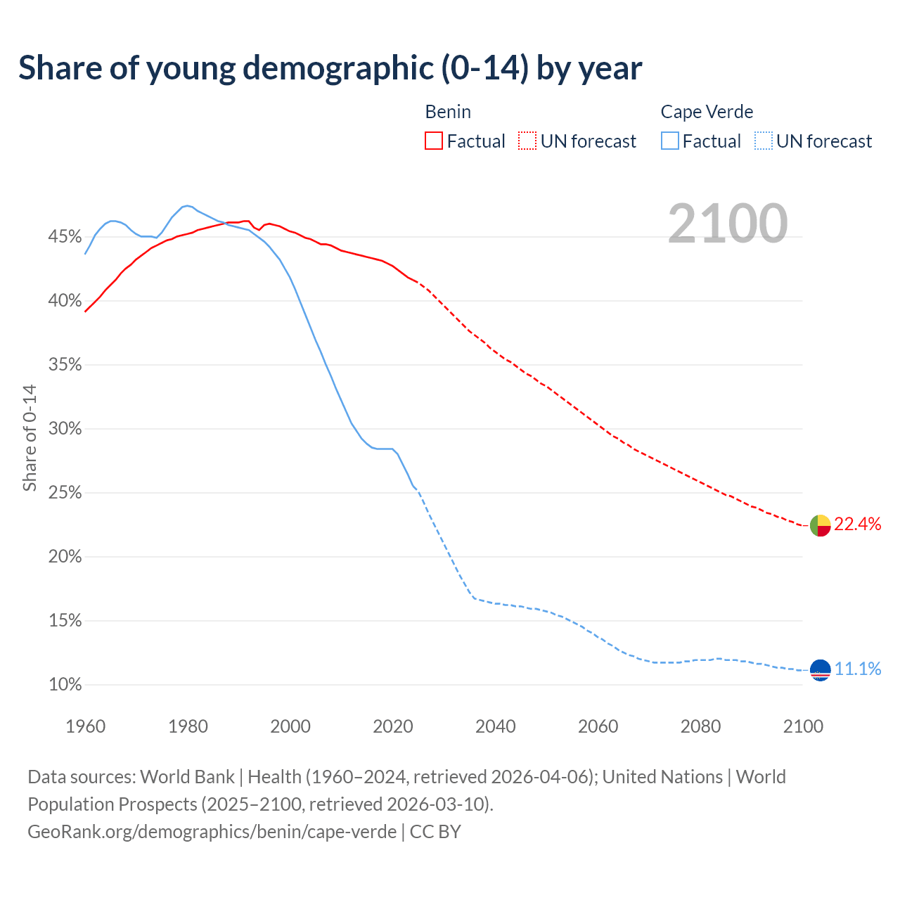- The share of young demographic (0-15 years old) in Benin is 41.6% vs 25.5% in Cape Verde.