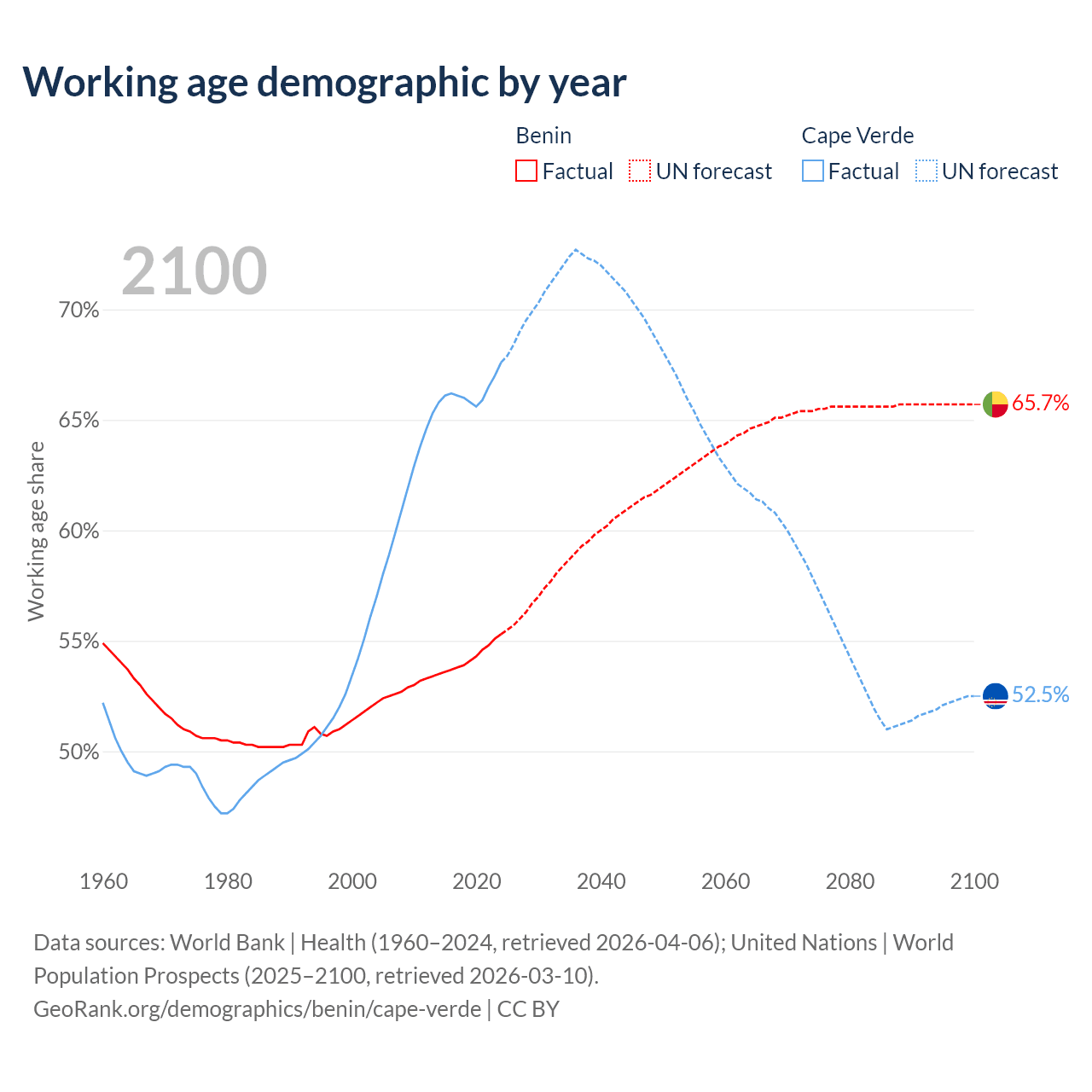 Median age Benin vs Cape Verde, 1960-2100