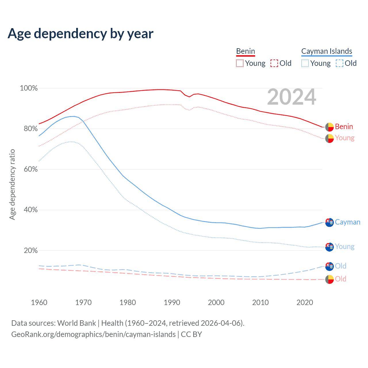 - The share of young demographic (0-15 years old) in Benin is 41.6% vs 16.2% in the Cayman Islands.