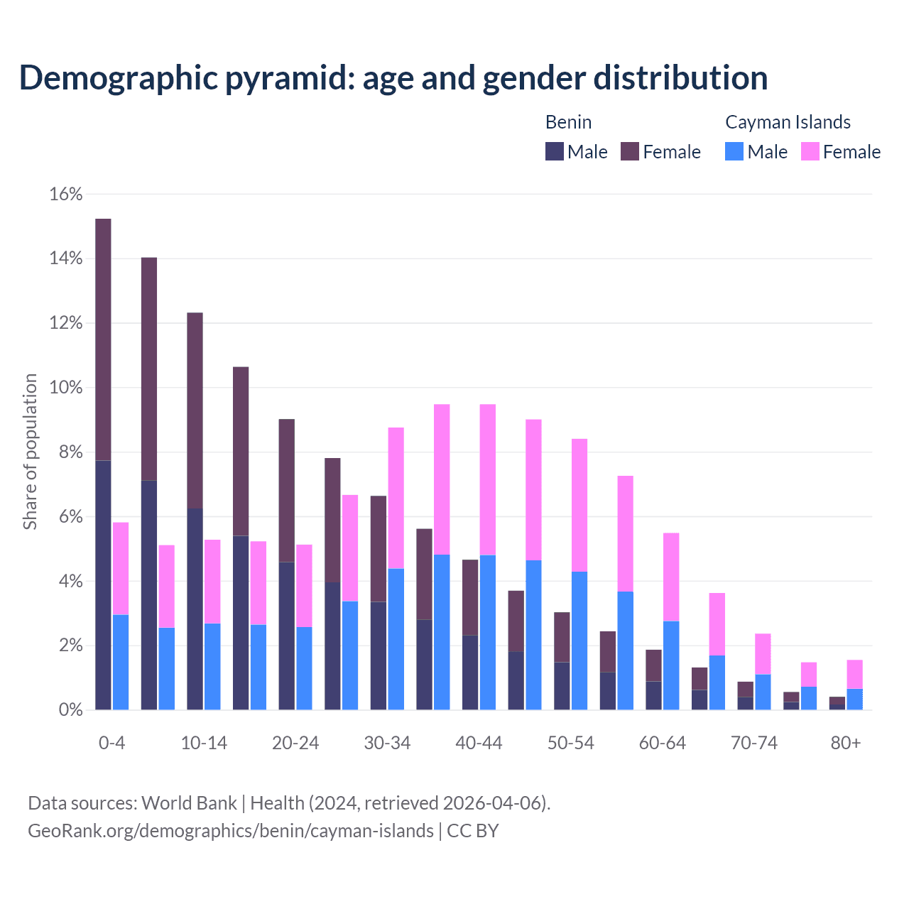 - As of 2026, the population of Benin is 15.3M vs 77.6K in the Cayman Islands - 196.8 times difference.