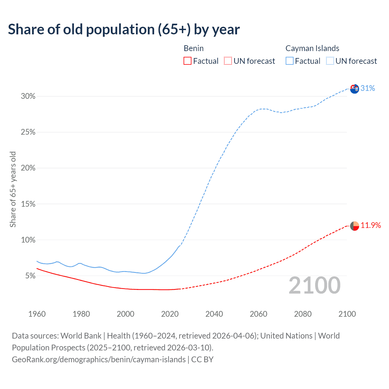 - The share of old-age demographic (65+) in Benin is 3.12% vs 9% in the Cayman Islands.