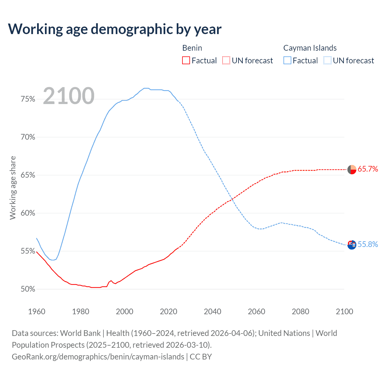 - Benin has 8.45M working age adults (aged 15-64) vs 58.1K in the Cayman Islands.