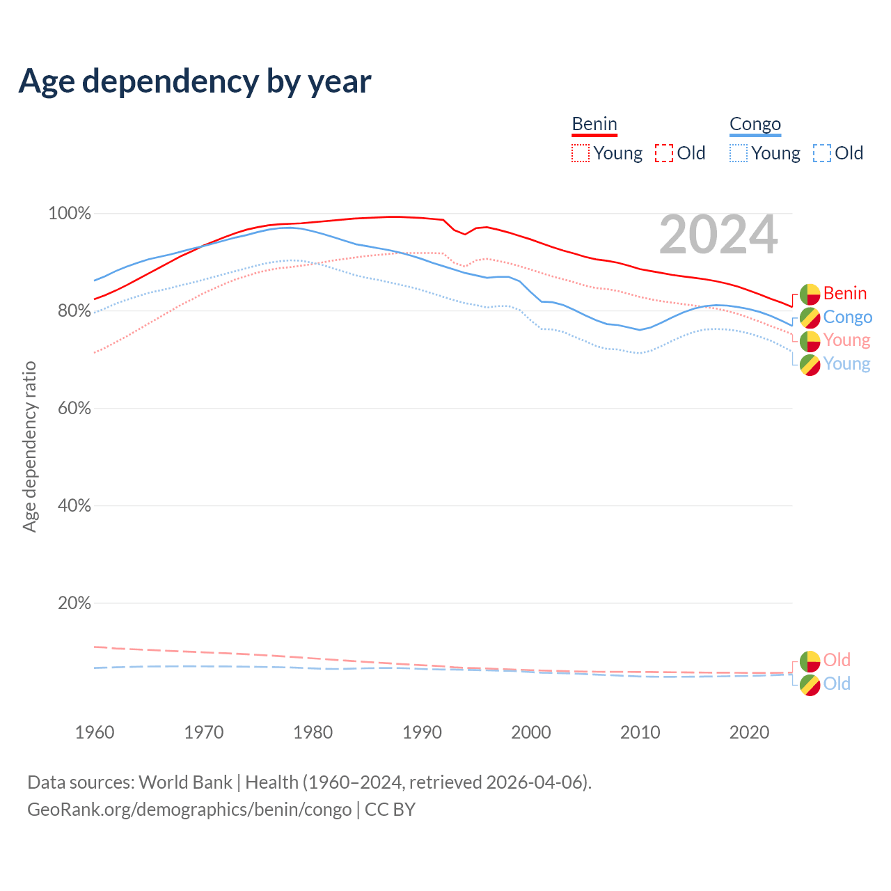 - Benin is ranked 179/196 by median age (oldest to youngest) vs 170/196 for the Congo.