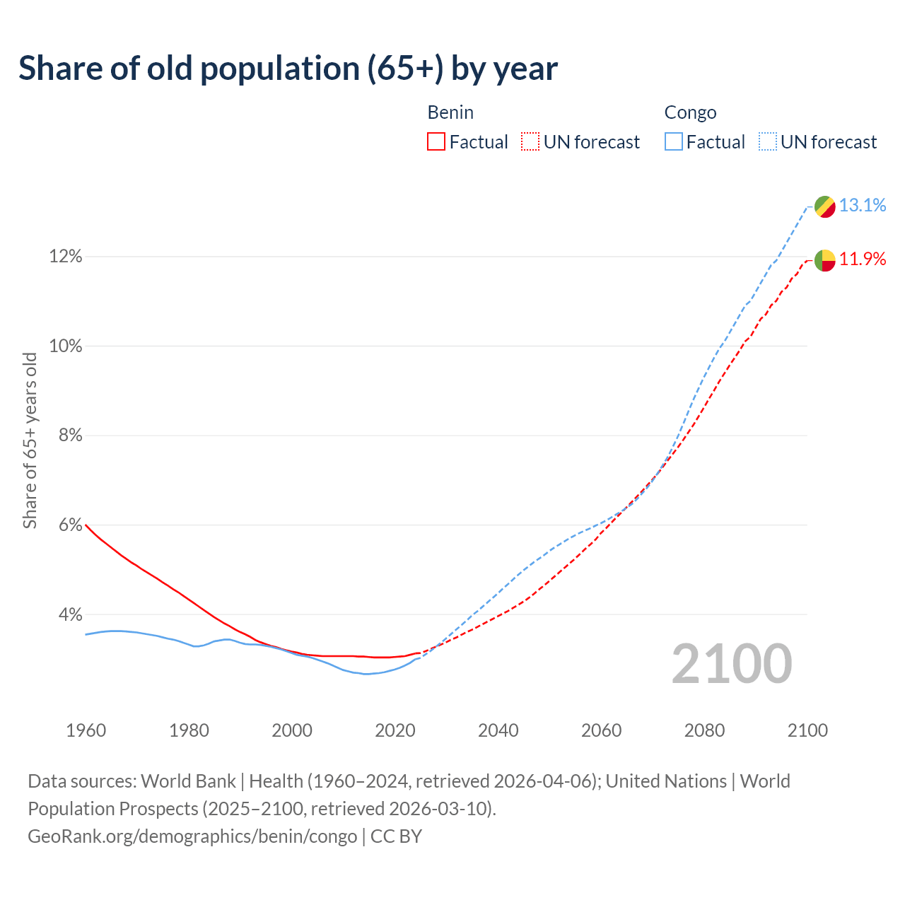 - The share of old-age demographic (65+) in Benin is 3.12% vs 2.99% in the Congo.
