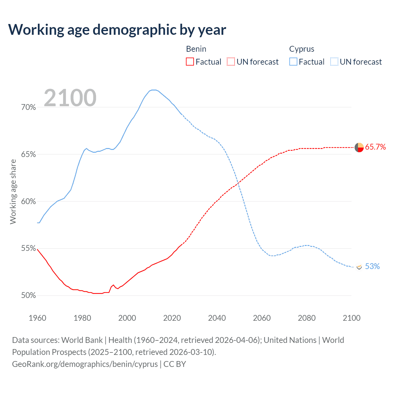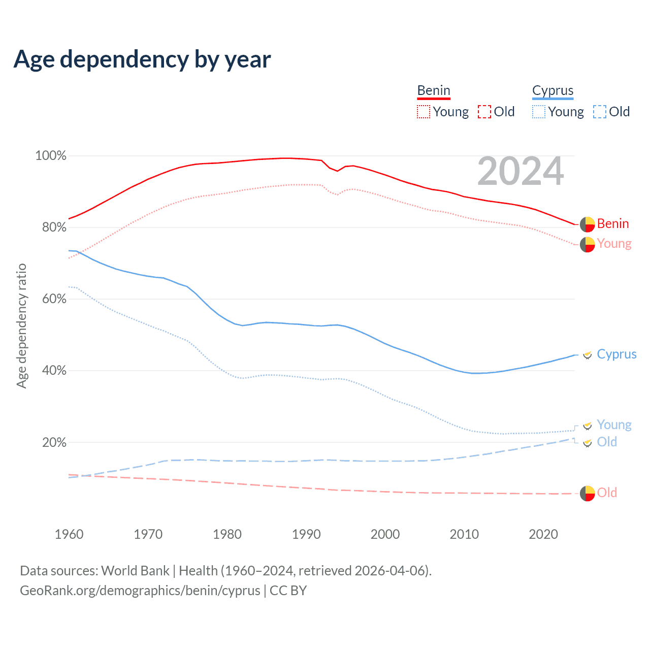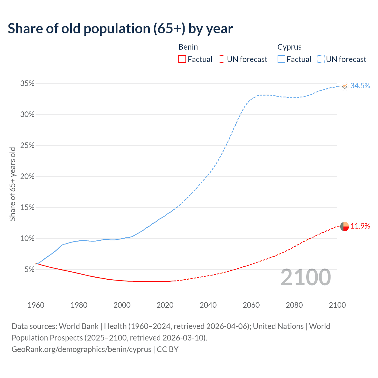 - The share of old-age demographic (65+) in Benin is 3.12% vs 14.6% in Cyprus.