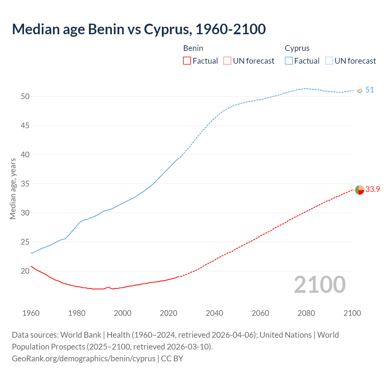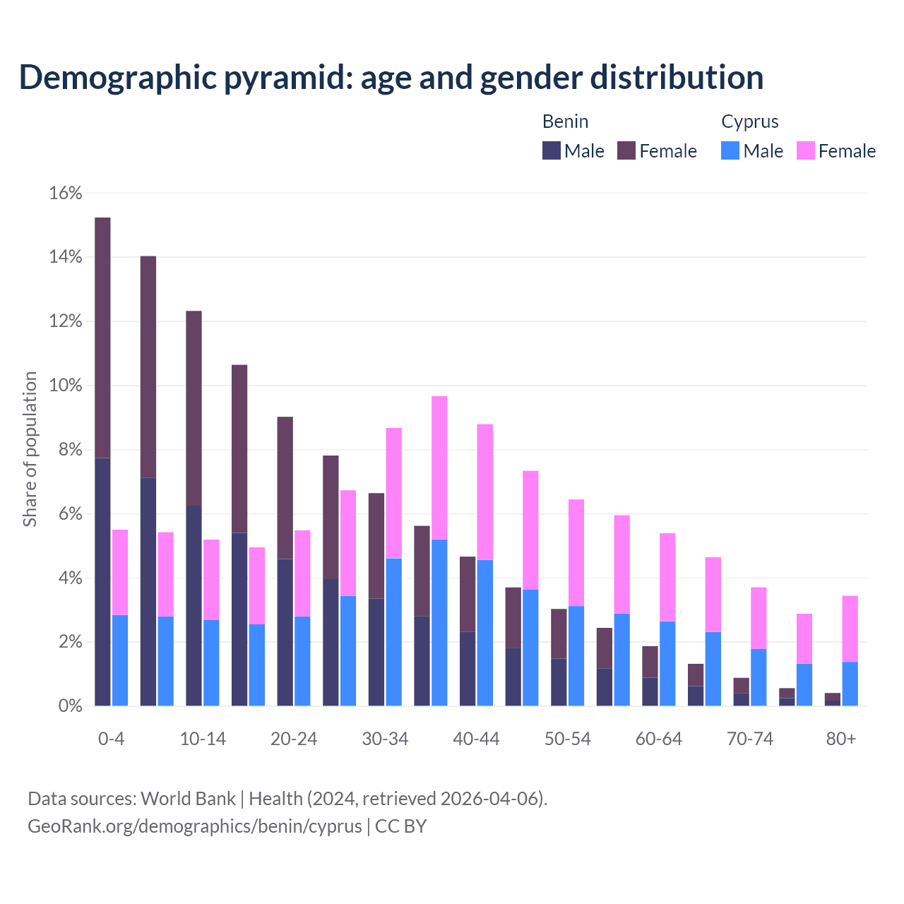 - As of 2026, the population of Benin is 15.3M vs 1.39M in Cyprus - 11 times difference.